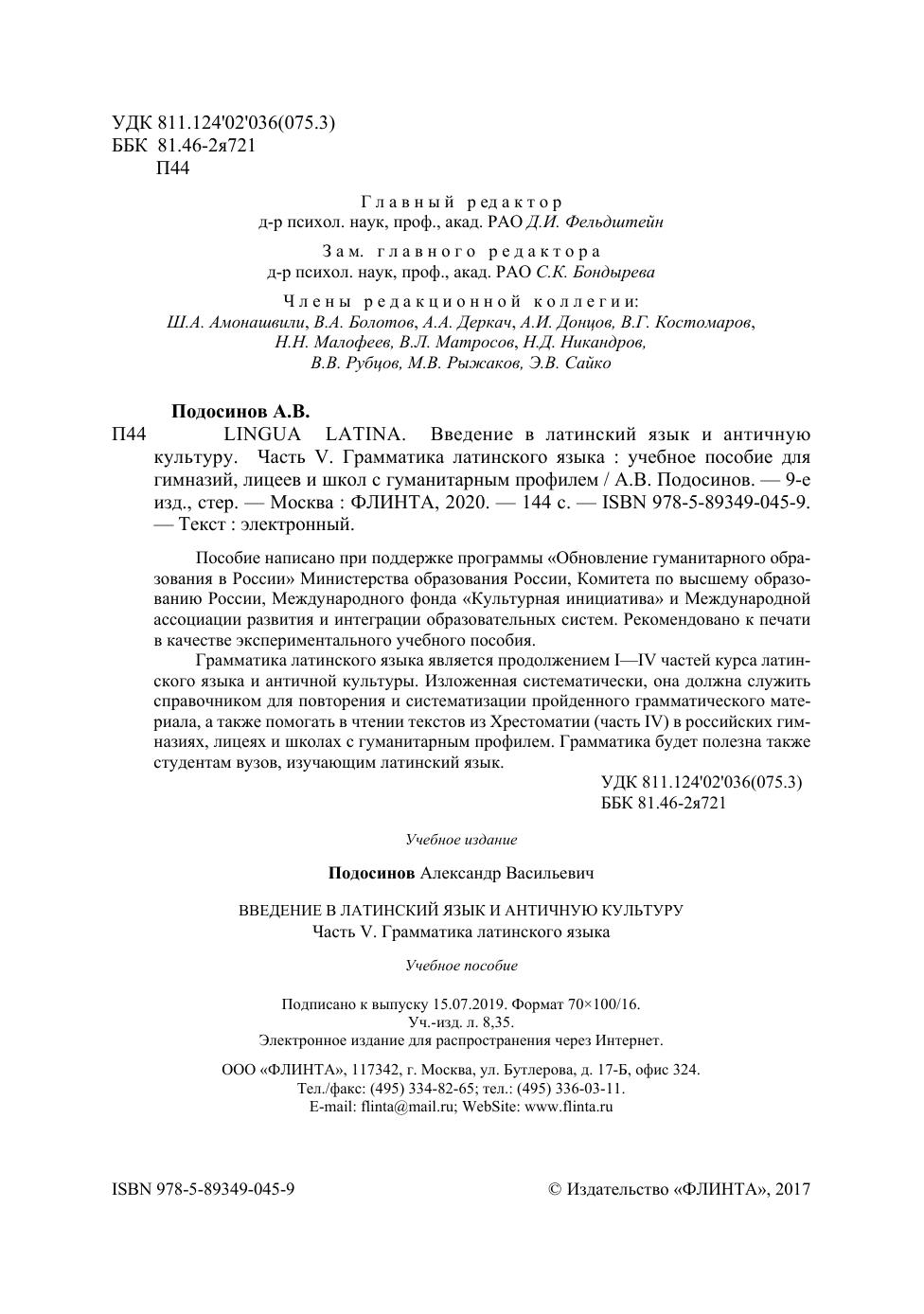 LINGUA LATINA. Введение в латинский язык и античную культуру. Часть V. Грамматика латинского языка : учебное пособие для гимназий, лицеев и школ с гуманитарным профилем