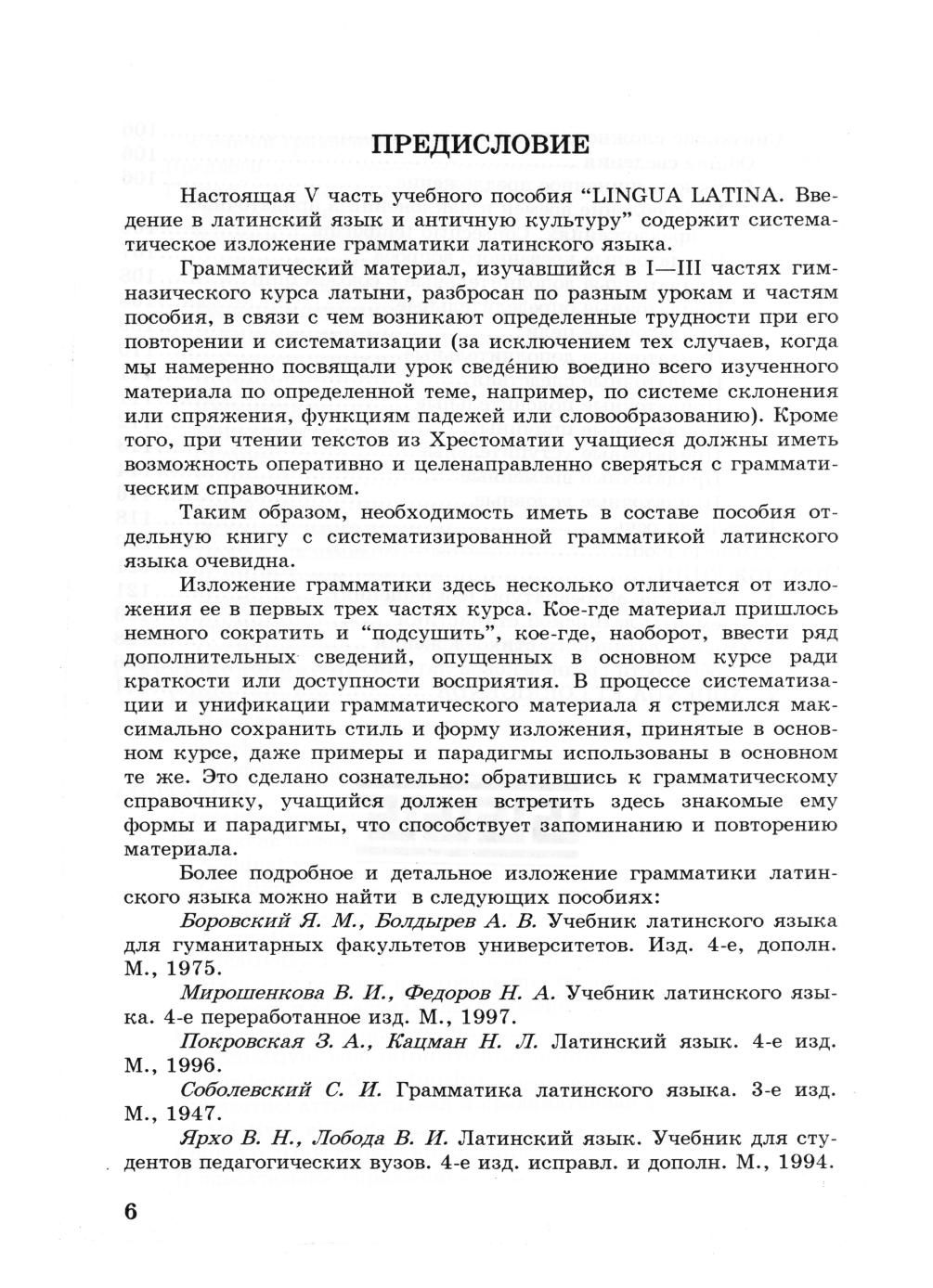 Грамматика латинского языка является продолжением I—IV частей курса латинского языка и античной культуры. Изложенная систематически, она должна служить справочником для повторения и систематизации пройденного грамматического материала, а также помогать в чтении текстов из Хрестоматии (часть IV) в российских гимназиях, лицеях и школах с гуманитарным профилем. Грамматика будет полезна также студентам вузов, изучающим латинский язык.