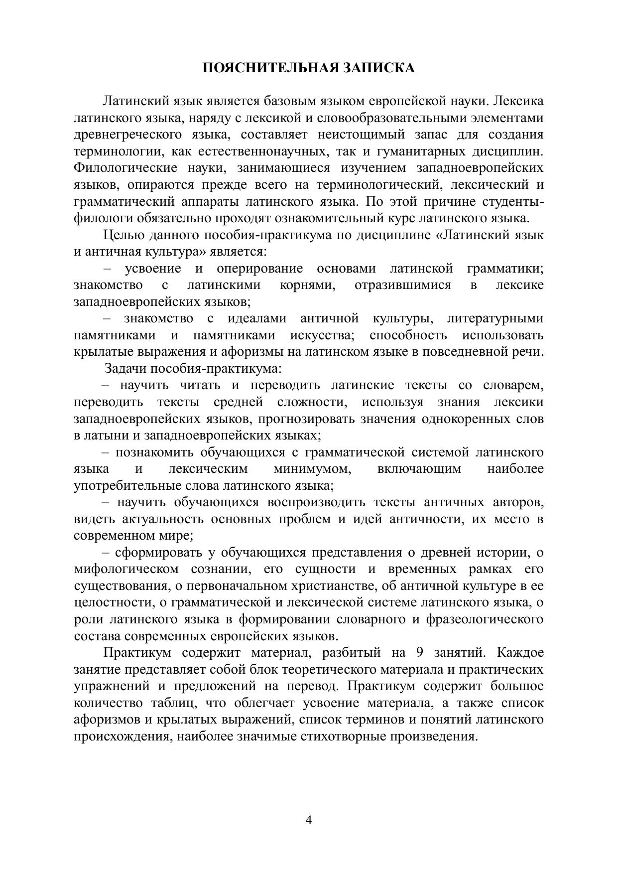 Практикум представляет собой вводно-ознакомительный курс по латинскому языку, включающий девять занятий, направленных на формирование произносительных, грамматических и лексических навыков, а также комментарии и тексты на латинском языке для заучивания.