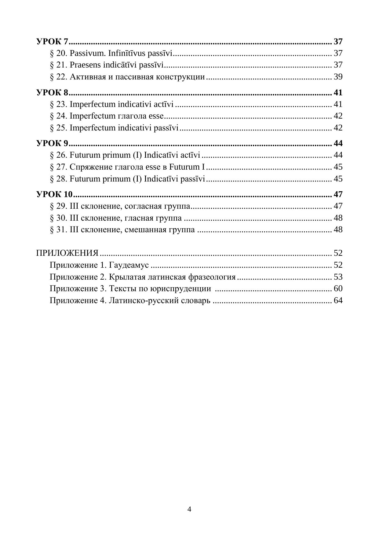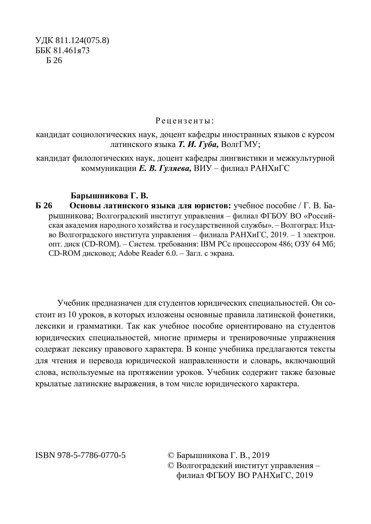 Учебник предназначен для студентов юридических специальностей. Он со-стоит из 10 уроков, в которых изложены основные правила латинской фонетики, лексики и грамматики. Так как учебное пособие ориентировано на студентов юридических специальностей, многие примеры и тренировочные упражнения содержат лексику правового характера. В конце учебника предлагаются тексты для чтения и перевода юридической направленности и словарь, включающий слова, используемые на протяжении уроков. Учебник содержит также базовые крылатые латинские выражения, в том числе юридического характера.