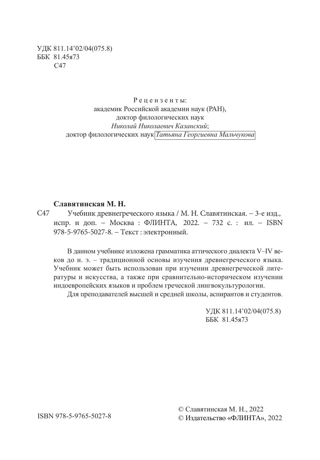 В данном учебнике изложена грамматика аттического диалекта V‒IV веков до н. э. – традиционной основы изучения древнегреческого языка. Учебник может быть использован при изучении древнегреческой литературы и искусства, а также при сравнительно-историческом изучении индоевропейских языков и проблем греческой лингвокультурологии. Для преподавателей высшей и средней школы, аспирантов и студентов.