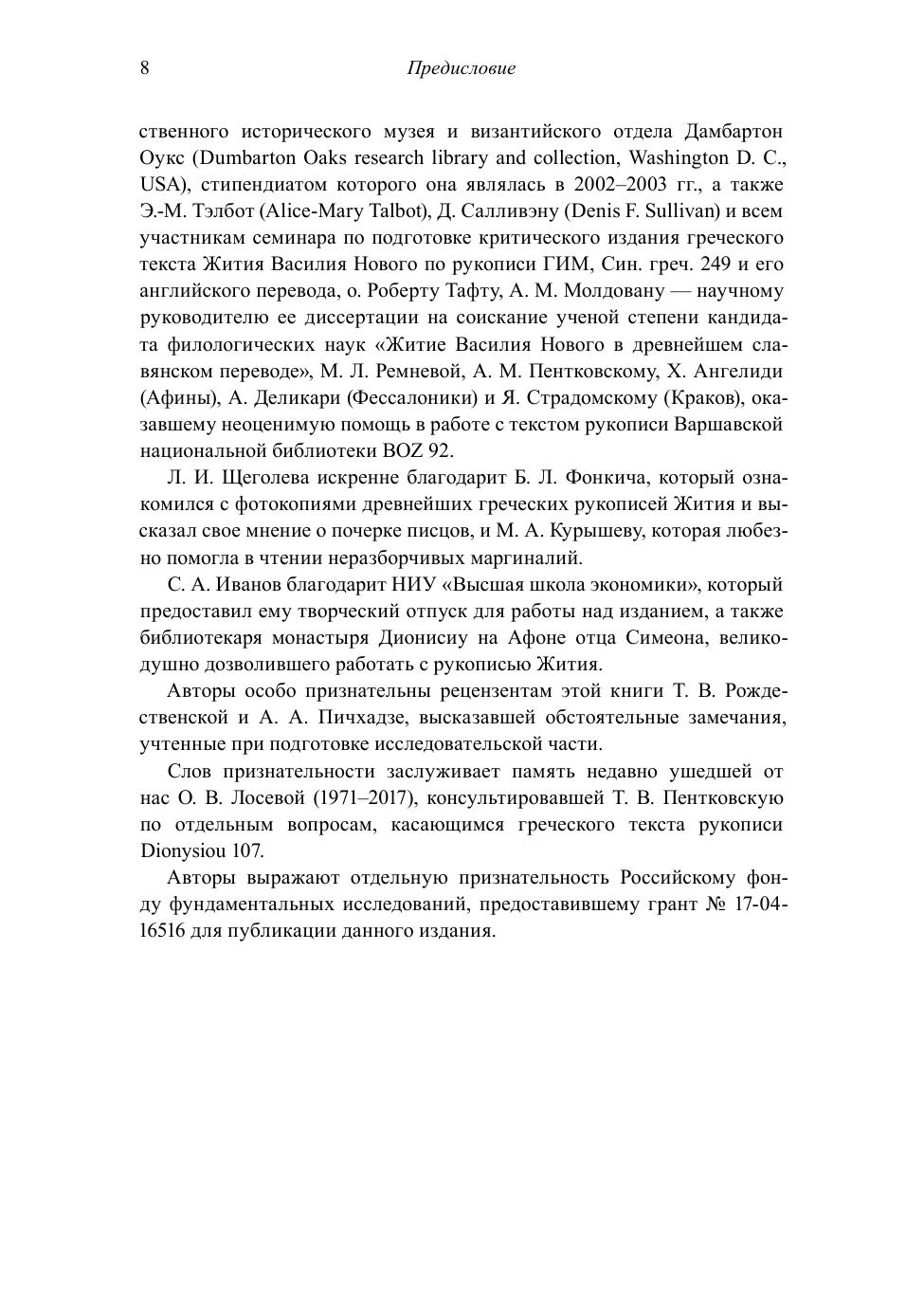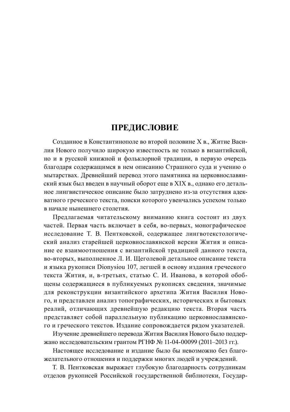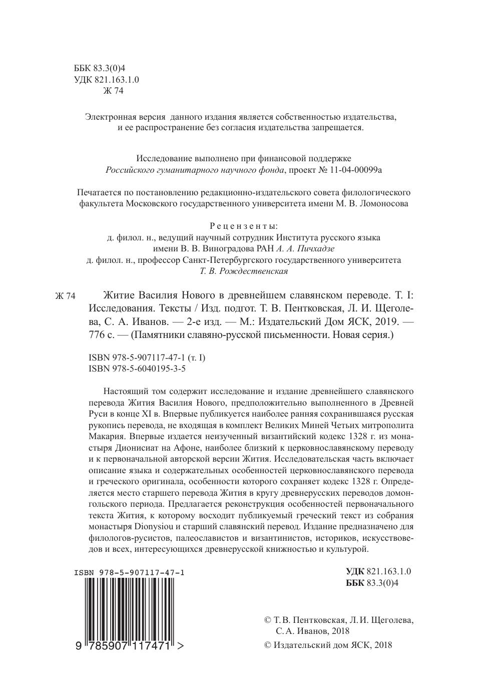 Настоящий том содержит исследование и издание древнейшего славянского перевода Жития Василия Нового, предположительно выполненного в Древней Руси в конце XI в. Впервые публикуется наиболее ранняя сохранившаяся русская рукопись перевода, не входящая в комплект Великих Миней Четьих митрополита Макария. Впервые издается неизученный византийский кодекс 1328 г. из монастыря Дионисиат на Афоне, наиболее близкий к церковнославянскому переводу и к первоначальной авторской версии Жития. Исследовательская часть включает описание языка и содержательных особенностей церковнославянского перевода и греческого оригинала, особенности которого сохраняет кодекс 1328 г. Определяется место старшего перевода Жития в кругу древнерусских переводов домонгольского периода. Предлагается реконструкция особенностей первоначального текста Жития, к которому восходит публикуемый греческий текст из собрания монастыря Dionysiou и старший славянский перевод. Издание предназначено для филологов-русистов, палеославистов и византинистов, историков, искусствоведов и всех, интересующихся древнерусской книжностью и культурой.