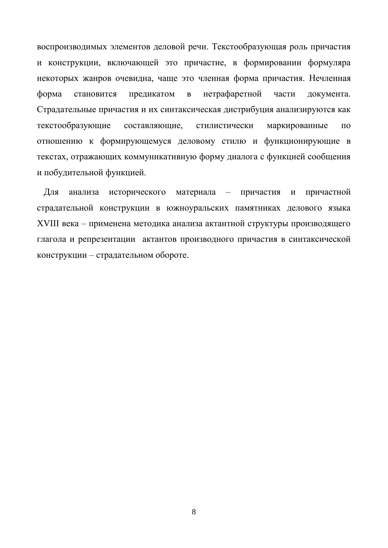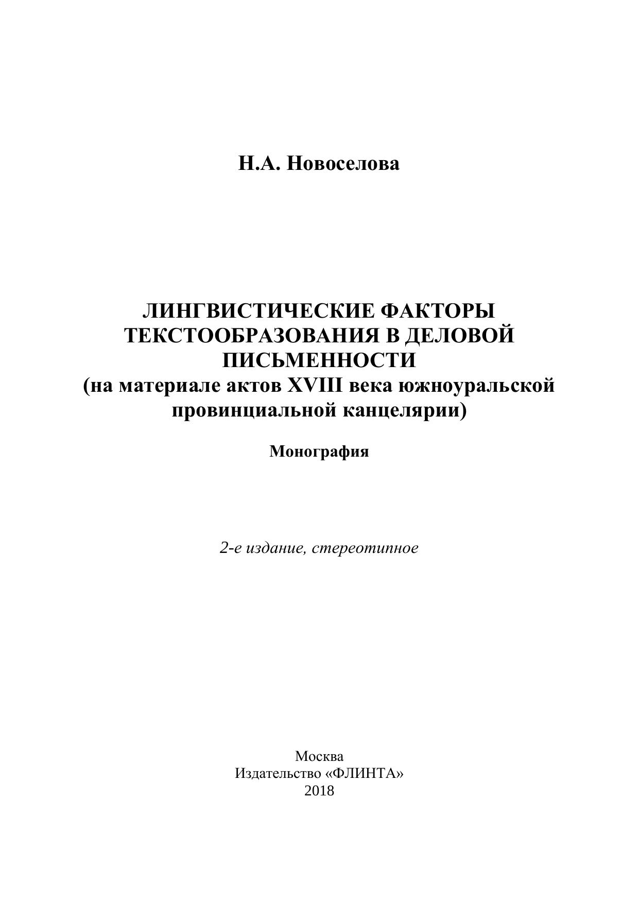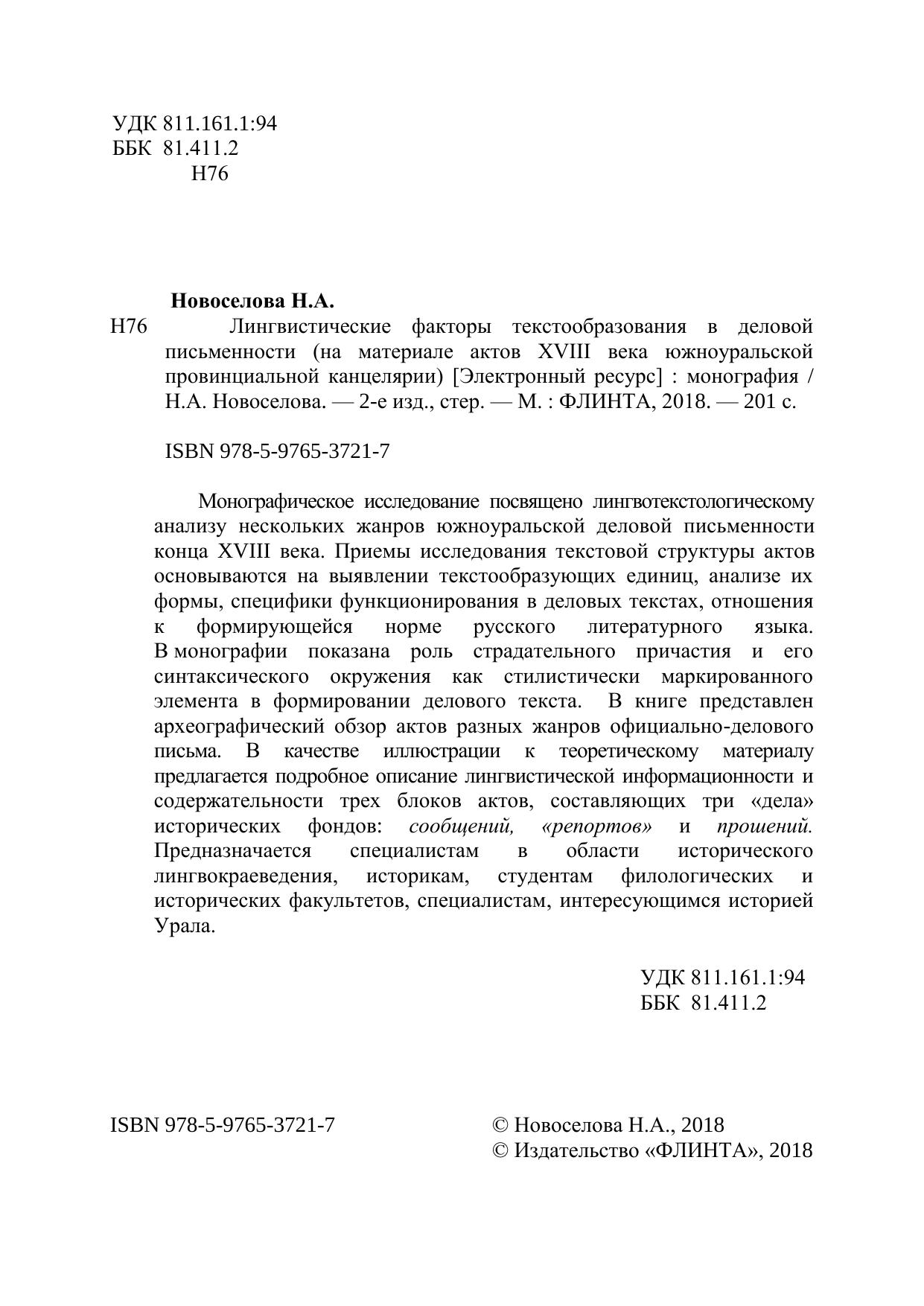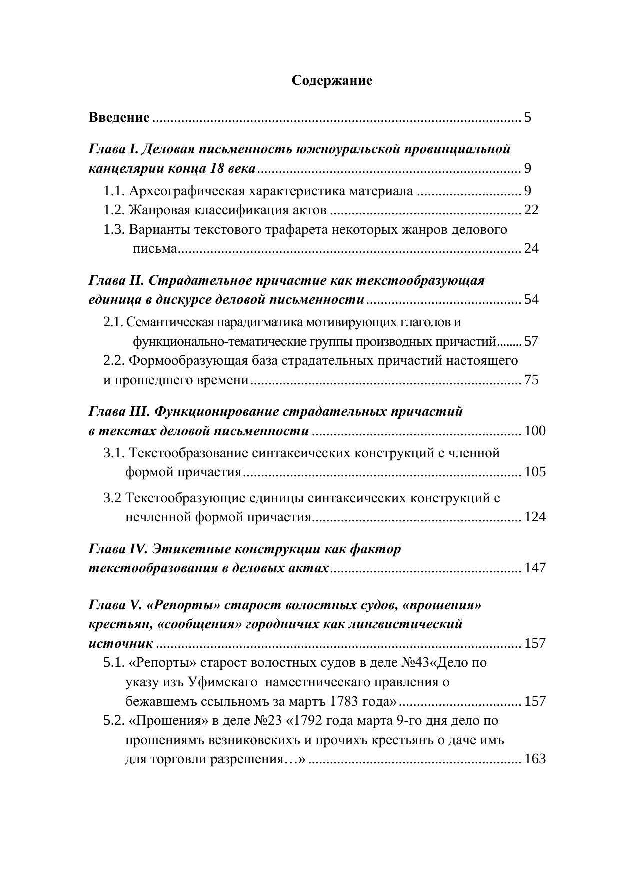 Монографическое исследование посвящено лингвотекстологическому анализу нескольких жанров южноуральской деловой письменности конца XVIII века. Приемы исследования текстовой структуры актов основываются на выявлении текстообразующих единиц, анализе их формы, специфики функционирования в деловых текстах, отношения к формирующейся норме русского литературного языка. В монографии показана роль страдательного причастия и его синтаксического окружения как стилистически маркированного элемента в формировании делового текста. В книге представлен археографический обзор актов разных жанров официально-делового письма. В качестве иллюстрации к теоретическому материалу