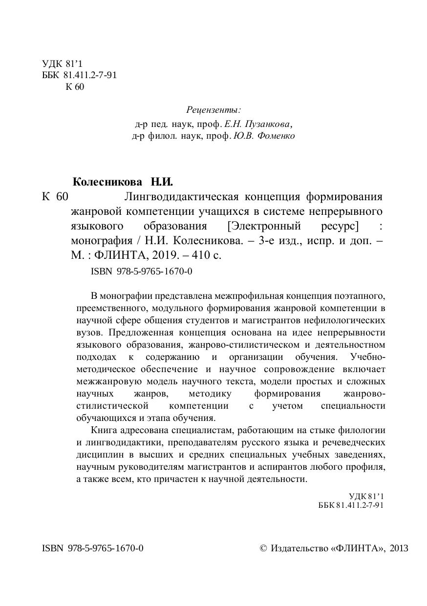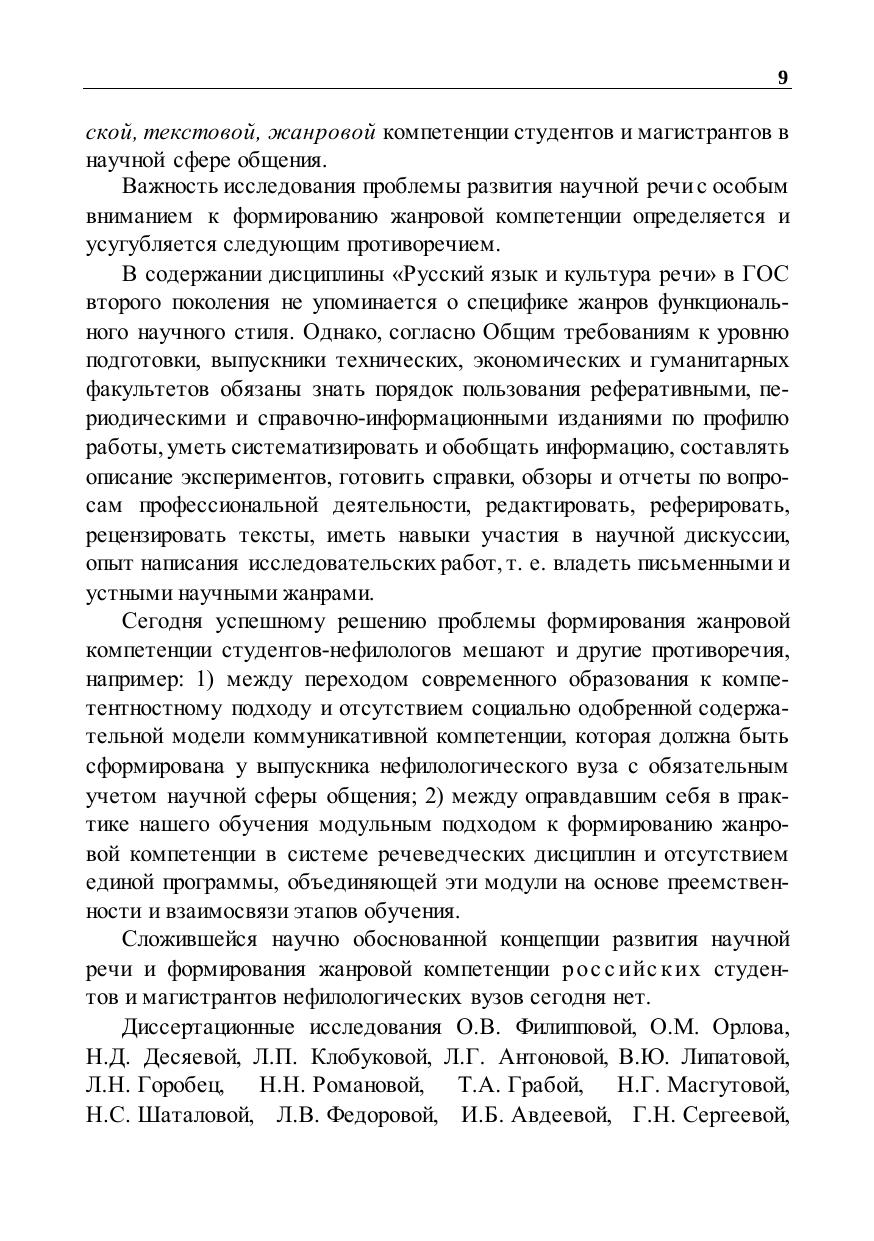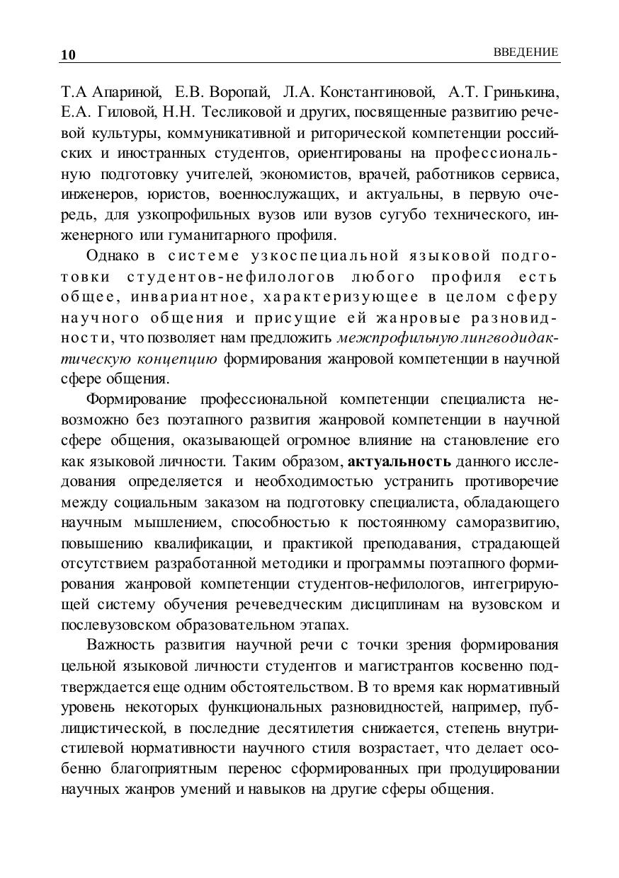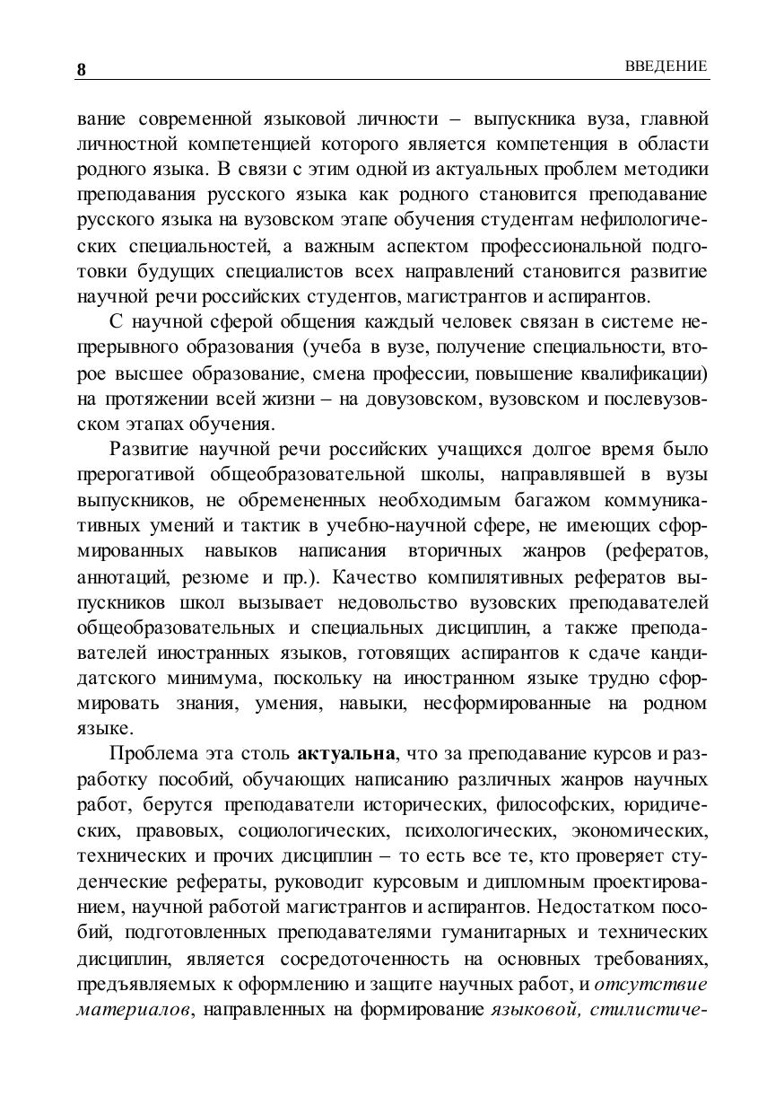 вузов. Предложенная концепция основана на идее непрерывности языкового образования, жанрово-стилистическом и деятельностном подходах к содержанию и организации обучения. Учебно-методическое обеспечение и научное сопровождение включает межжанровую модель научного текста, модели простых и сложных научных жанров, методику формирования жанрово-стилистической компетенции с учетом специальности обучающихся и этапа обучения. Книга адресована специалистам, работающим на стыке филологии и лингводидактики, преподавателям русского языка и речеведческих дисциплин в высших и средних специальных учебных заведениях, научным руководителям магистрантов и аспирантов любого профиля, а также всем, кто причастен к научной деятельности.
