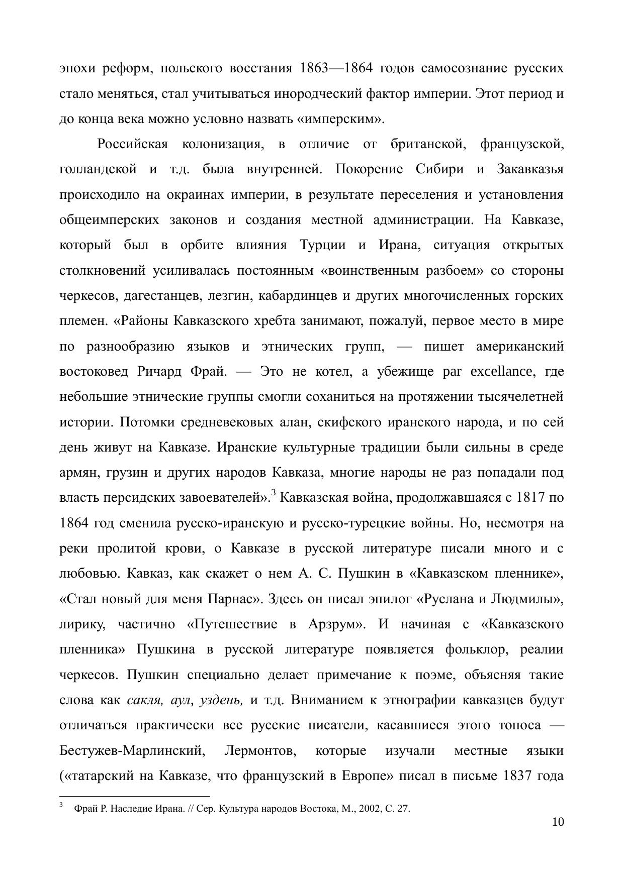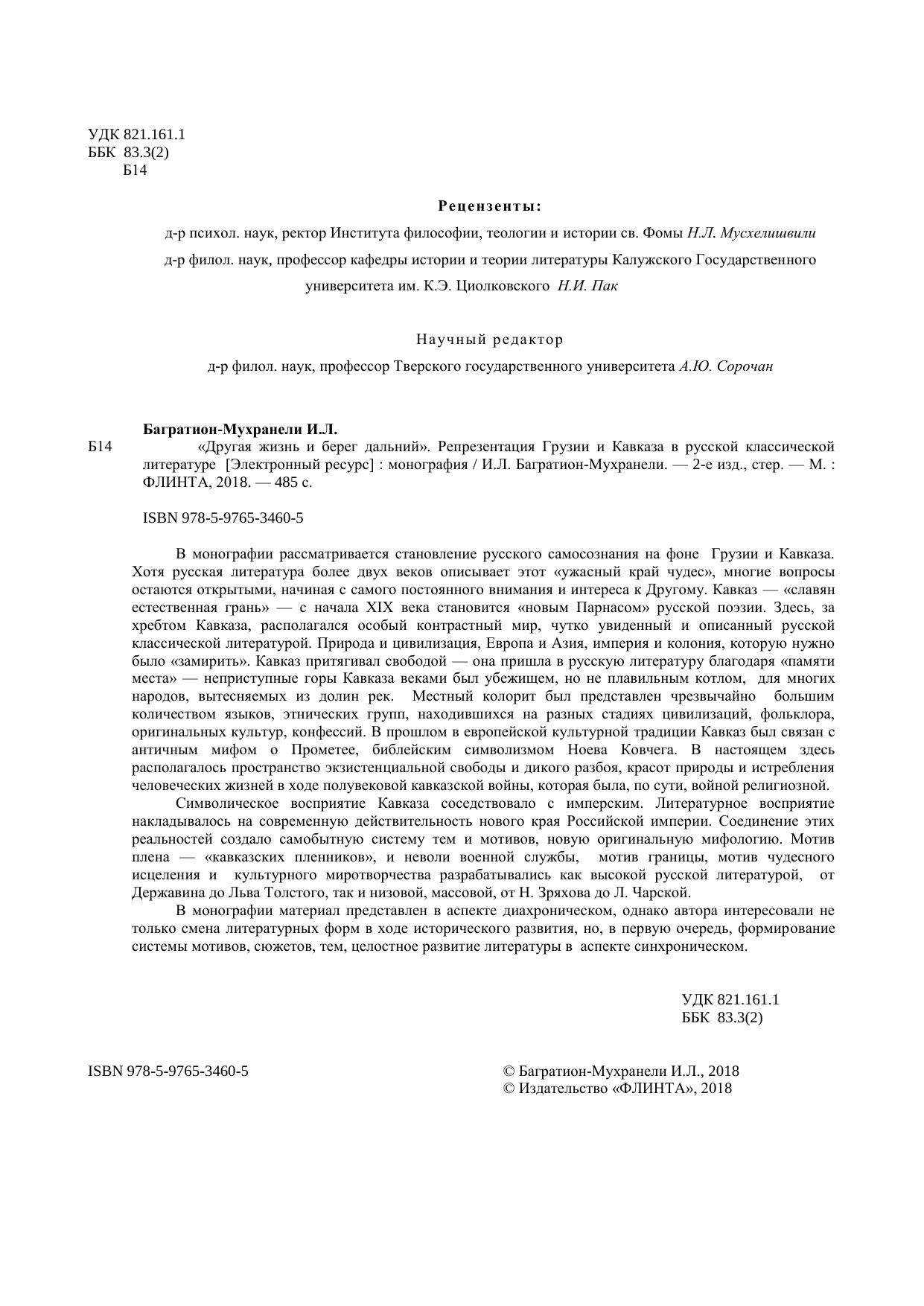 В монографии рассматривается становление русского самосознания на фоне Грузии и Кавказа. Хотя русская литература более двух веков описывает этот «ужасный край чудес», многие вопросы остаются открытыми, начиная с самого постоянного внимания и интереса к Другому. Кавказ — «славян естественная грань» — с начала XIX века становится «новым Парнасом» русской поэзии. Здесь, за хребтом Кавказа, располагался особый контрастный мир, чутко увиденный и описанный русской классической литературой. Природа и цивилизация, Европа и Азия, империя и колония, которую нужно было «замирить». Кавказ притягивал свободой — она пришла в русскую литературу благодаря «памяти места» — неприступные горы Кавказа веками был убежищем, но не плавильным котлом, для многих народов, вытесняемых из долин рек. Местный колорит был представлен чрезвычайно большим количеством языков, этнических групп, находившихся на разных стадиях цивилизаций, фольклора, оригинальных культур, конфессий. В прошлом в европейской культурной традиции Кавказ был связан с античным мифом о Прометее, библейским символизмом Ноева Ковчега. В настоящем здесь располагалось пространство экзистенциальной свободы и дикого разбоя, красот природы и истребления человеческих жизней в ходе полувековой кавказской войны, которая была, по сути, войной религиозной. Символическое восприятие Кавказа соседствовало с имперским. Литературное восприятие накладывалось на современную действительность нового края Российской империи. Соединение этих реальностей создало самобытную систему тем и мотивов, новую оригинальную мифологию. Мотив плена — «кавказских пленников», и неволи военной службы, мотив границы, мотив чудесного исцеления и культурного миротворчества разрабатывались как высокой русской литературой, от Державина до Льва Толстого, так и низовой, массовой, от Н. Зряхова до Л. Чарской. В монографии материал представлен в аспекте диахроническом, однако автора интересовали не только смена литературных форм в ходе исторического развития, но, в первую очередь, формирование системы мотивов, сюжетов, тем, целостное развитие литературы в аспекте синхроническом