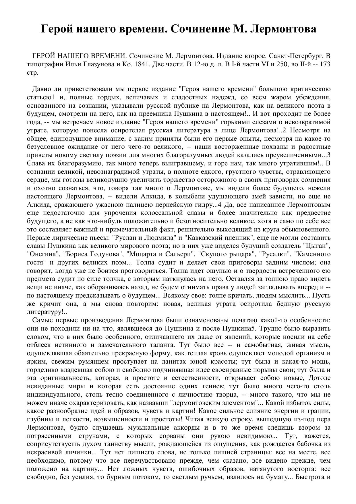 «Герой нашего времени». Соч. М. Лермонтова