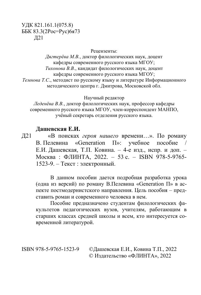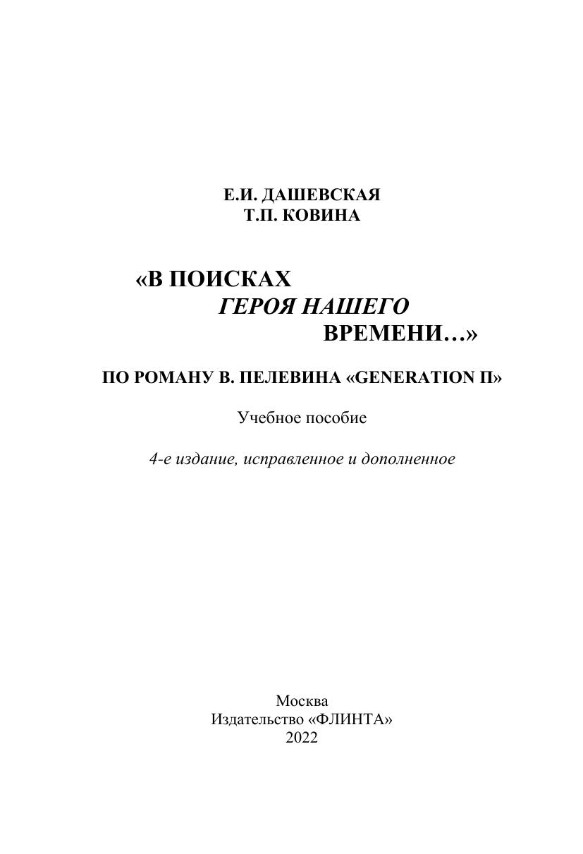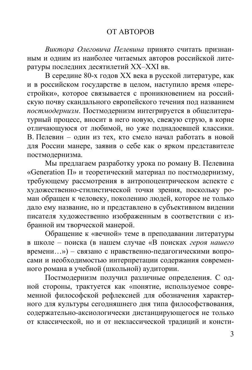 В данном пособии дается подробная разработка урока (одна из версий) по роману В.Пелевина «Generation П» в аспекте постмодернистского направления. Цель пособия – представить роман и современного человека в нем. Пособие предназначено студентам филологических факультетов педагогических вузов, учителям, работающим в старших классах средней школы и всем, кто интересуется современной литературой.