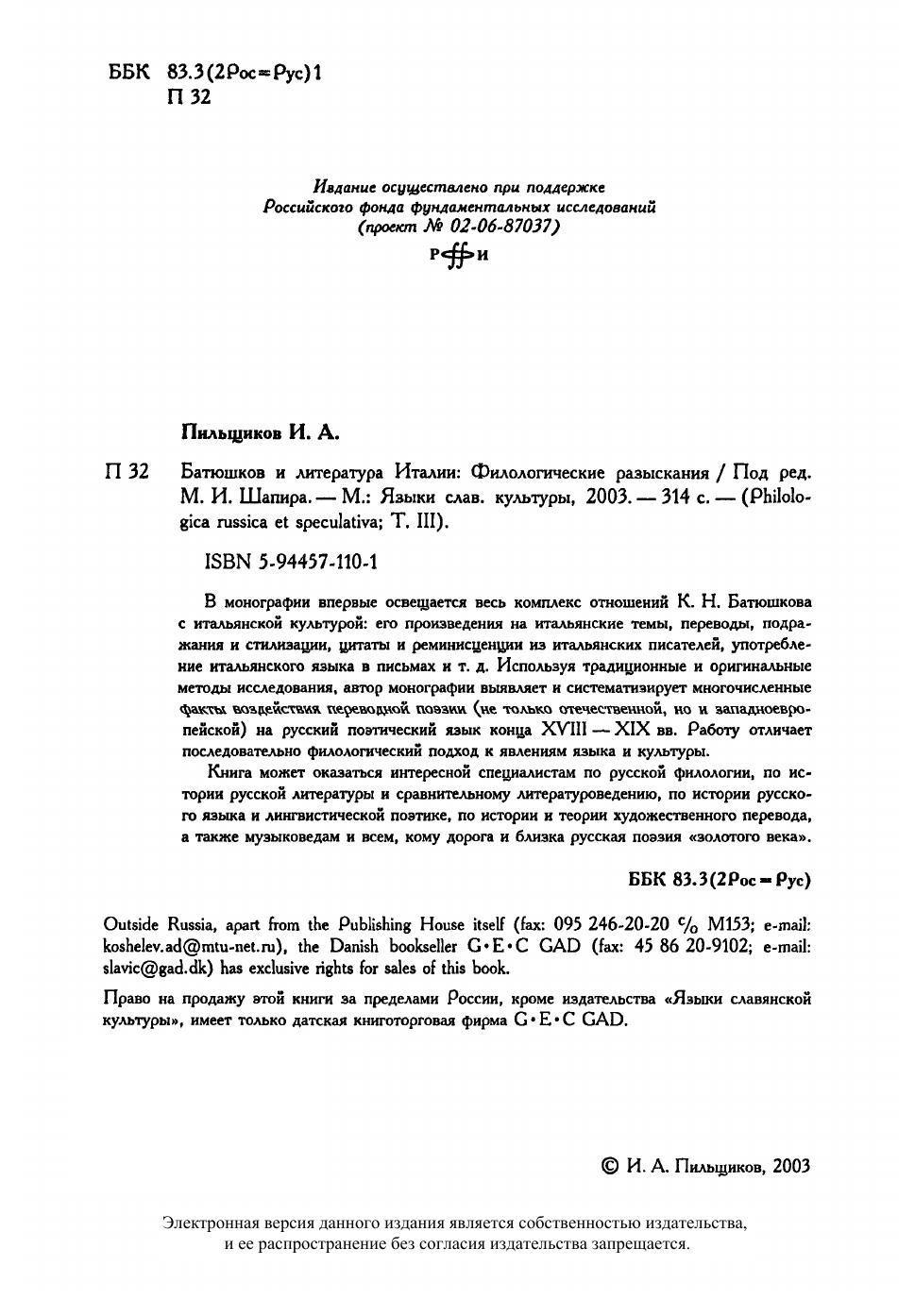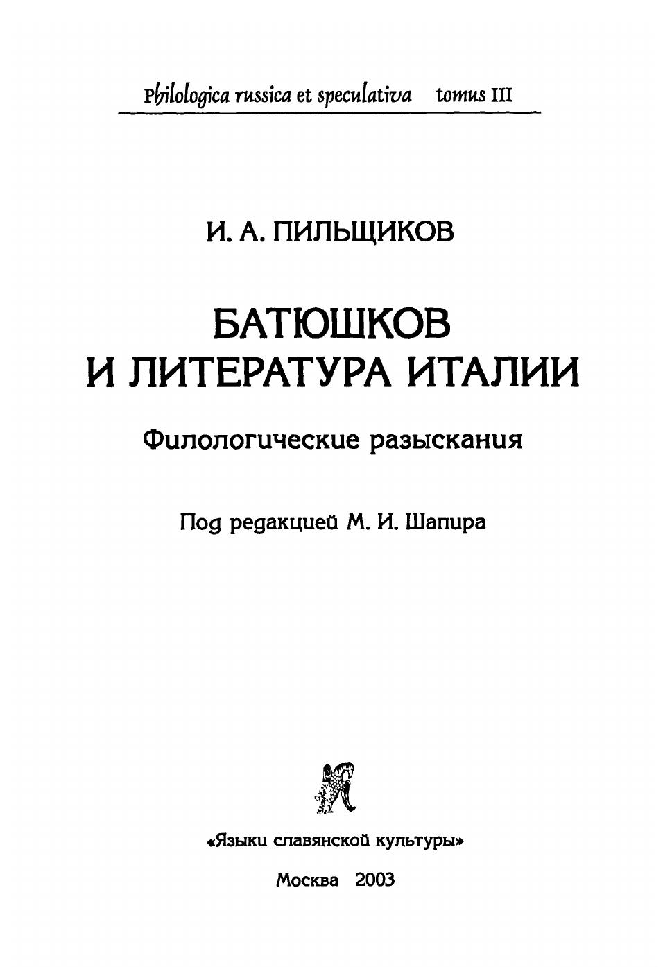 В монографии впервые освещается весь комплекс отношений К.Н.Батюшкова с итальянской культурой: его произведения на итальянские темы, переводы, подражания и стилизации, цитаты и реминисценции из итальянских писателей, употребление итальянского языка в письмах и т. д. Используя традиционные и оригинальные методы исследования, автор монографии выявляет и систематизирует многочисленные факты воздействия переводной поэзии (не только отечественной, но и западноевропейской) на русский поэтический язык конца XVIII - XIX вв. Работу отличает последовательно филологический подход к явлениям языка и культуры. Книга может оказаться интересной специалистам по русской филологии, по истории русской литературы и сравнительному литературоведению, по истории русского языка и лингвистической поэтике, по истории и теории художественного перевода, а также музыковедам и всем, кому дорога и близка русская поэзия "золотого века".