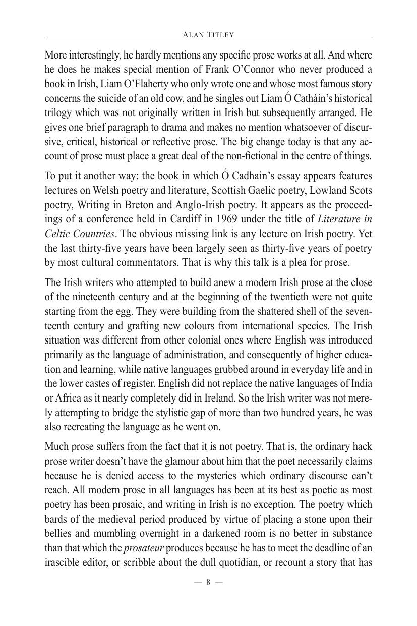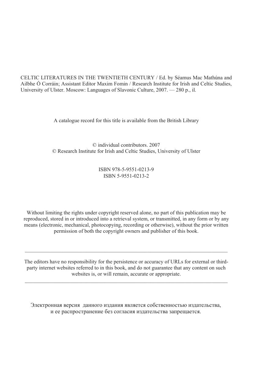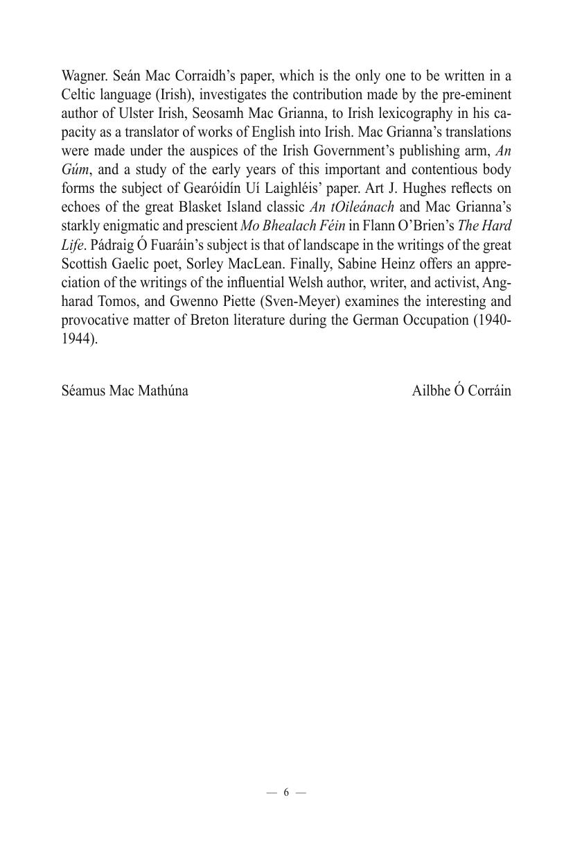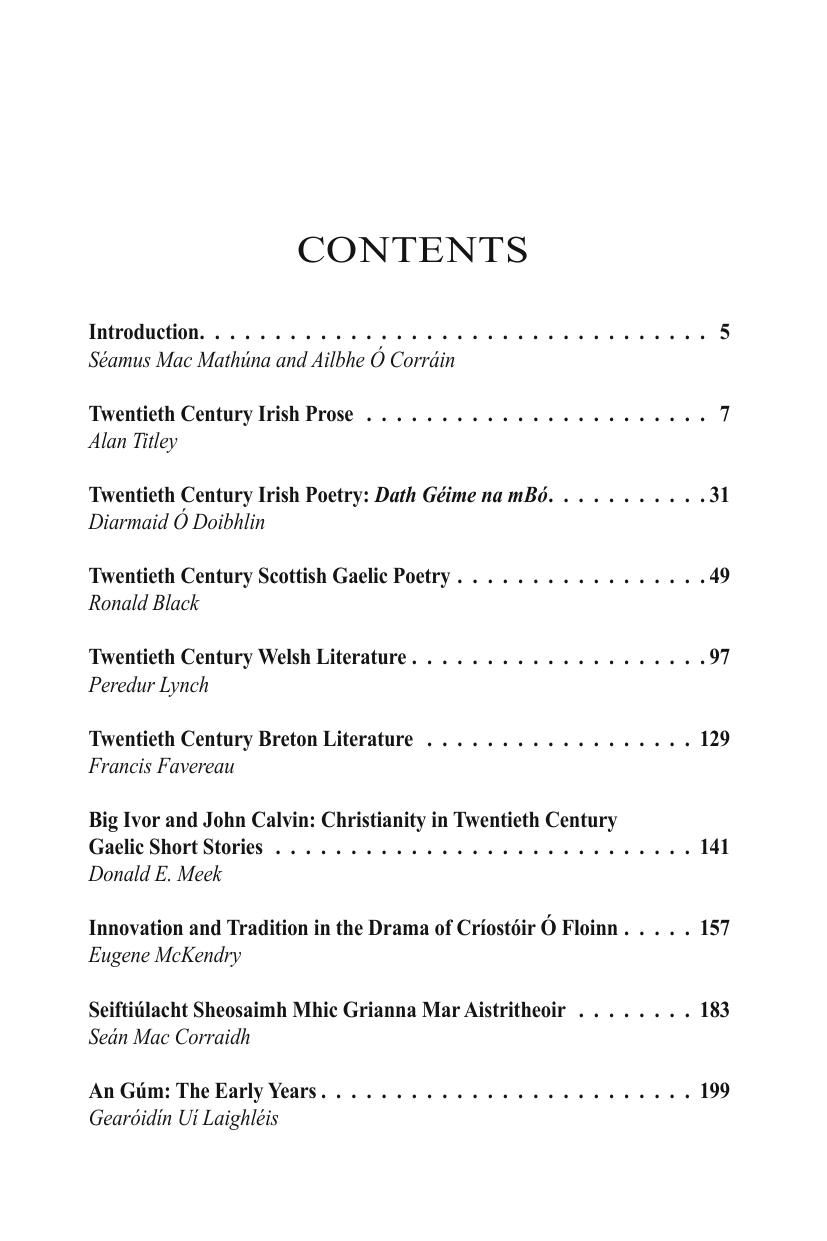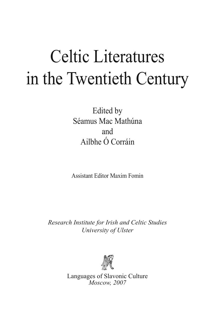The Centre for Irish and Celtic Studies at the University of Ulster hosted at Coleraine, between the 24th and 26th August 2000, a very successful and informative conference on ‘Celtic Literatures in the Twentieth Century’. The lectures and the discussions were of a high standard, and it was the intention of the organisers to edit and publish the proceedings as soon as possible thereafter. Unfortunately, due to difficulties in assembling some of the papers, this was not possible and, consequently, publication has been delayed much longer than was originally anticipated. Despite this delay, we feel that those papers which we have received merit publication at this time, not only because of their intrinsic merits, but also because they represent the views of the authors on their respective topics at the turn of the twenty first century and will hopefully be of value to those interested in the state of the modern Celtic literatures.