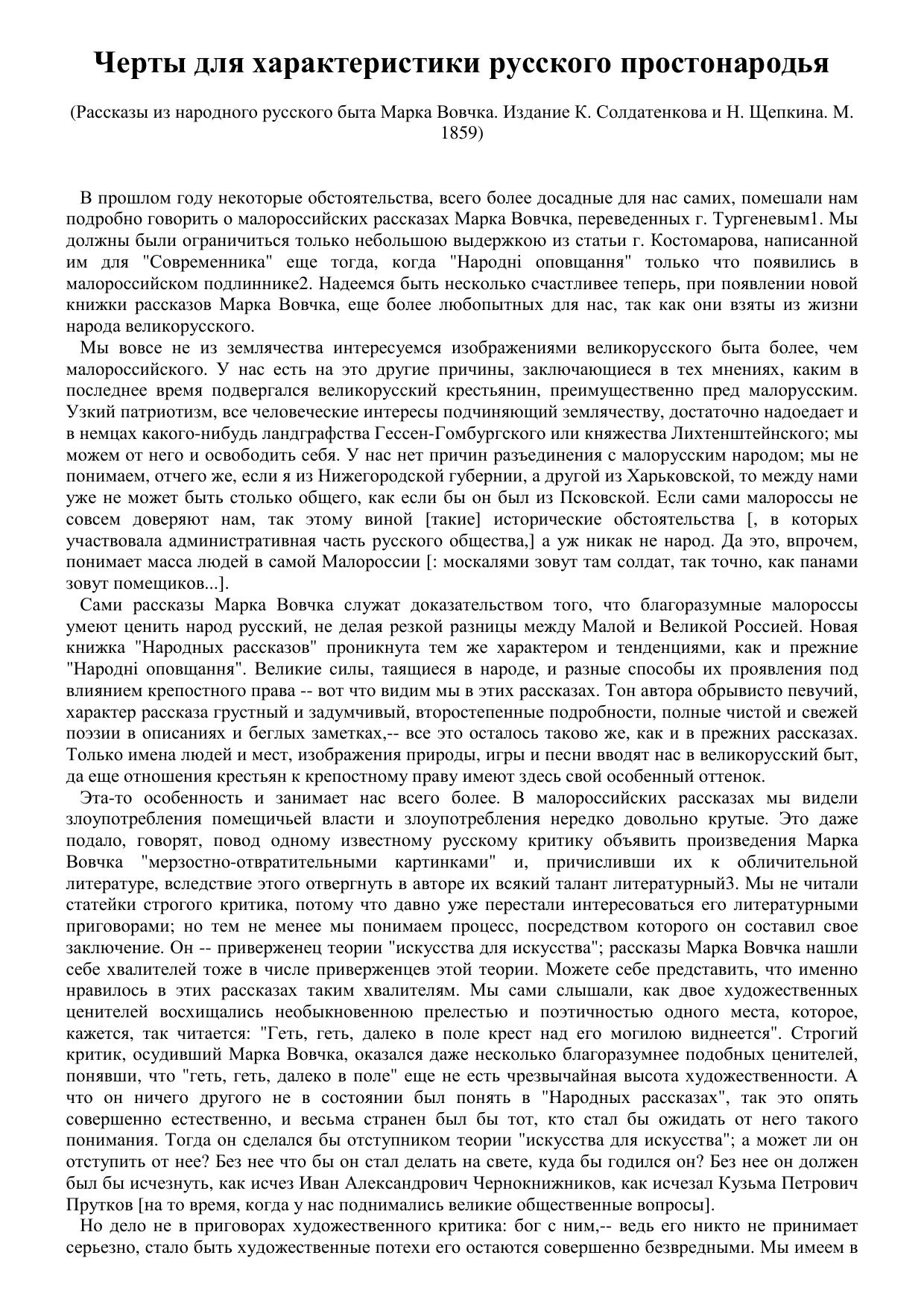 Черты для характеристики русского простонародья. Рассказы из народного русского быта Марка Вовчка