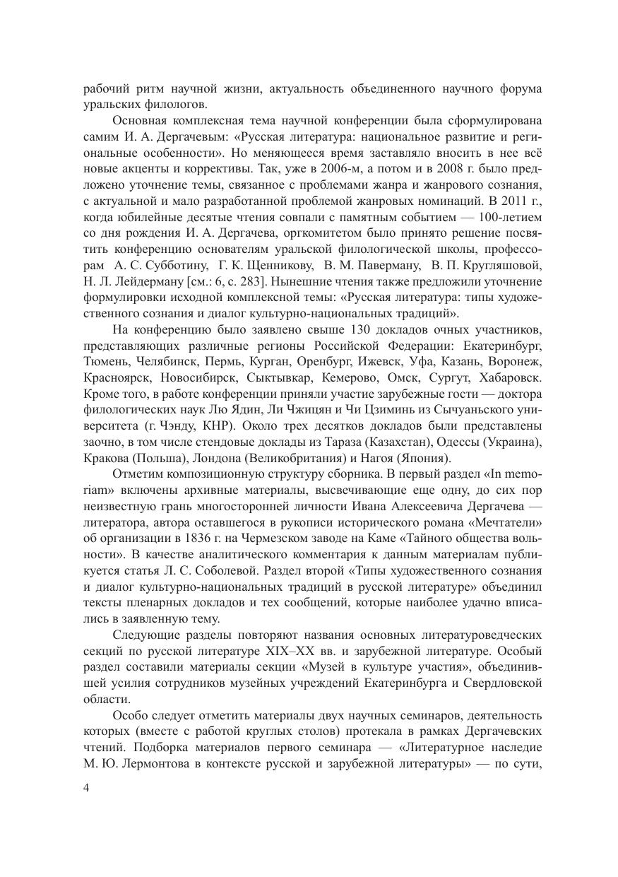 Сборник составлен по итогам научной конференции «Дергачевские чтения». Раздел «In memoriam» включает архивный материал – фрагменты исторического романа И. А. Дергачева «Мечтатели» и комментарии к нему. Основные разделы посвящены проблемам изучения русской и зарубежной литературы XIX–XXI вв., а также словесности Урала, актуальным вопросам литературной регионалистики и современным стратегиям музейного дела. Специальный раздел «Литературное наследие М. Ю. Лермонтова в диалоге времен» составлен из материалов научного семинара, прошедшего в рамках «Дергачевских чтений» и приуроченного к 200-летнему юбилею русского писателя-классика. Адресуется широкой филологической аудитории, а также всем, кто любит отечественную литературу, интересуется ее теорией, историей и современностью.