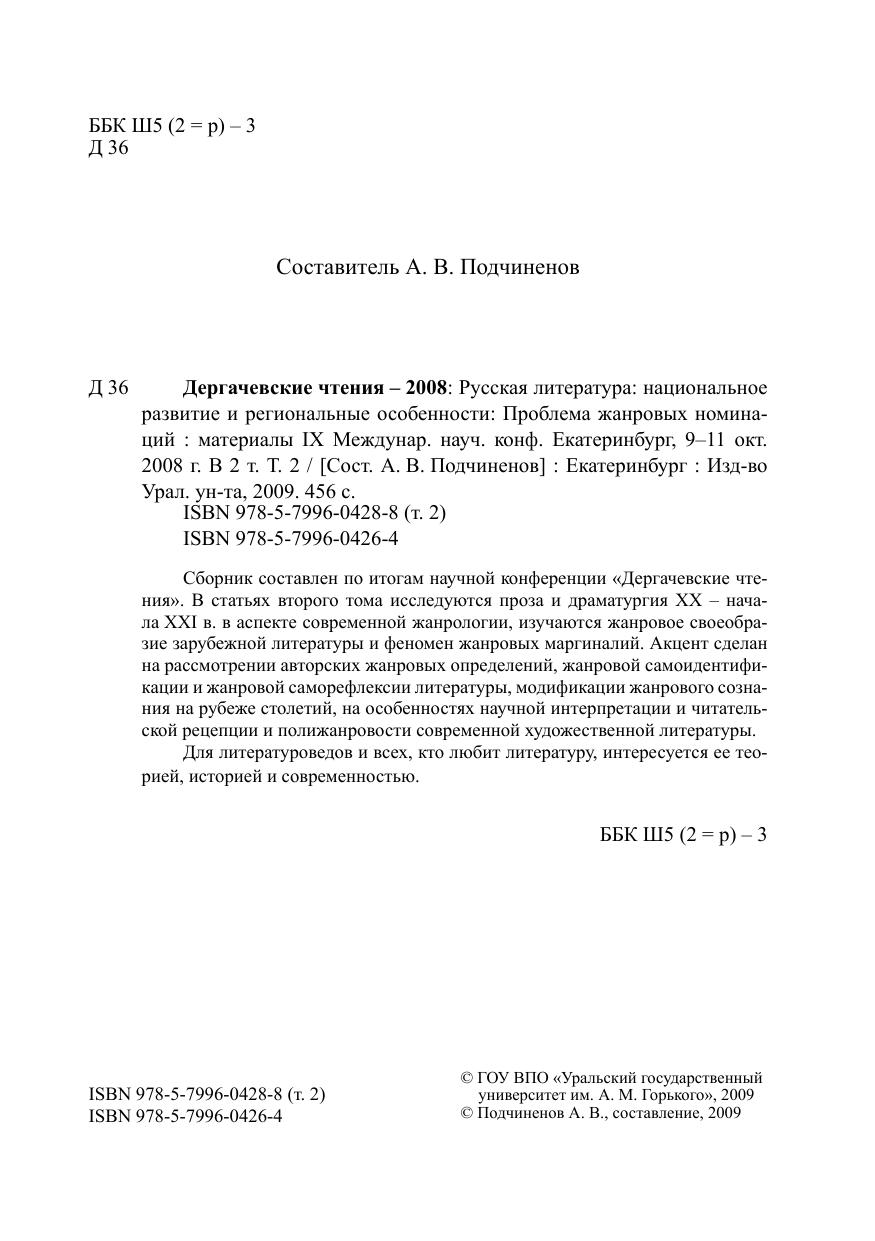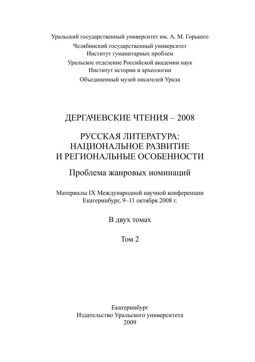 Дергачевские чтения 2008 Том 2 Русская литература: национальное развитие и региональные особенности. Материалы IX Междунар. науч. конф. Екатеринбург, 9–11 окт. 2008 г.