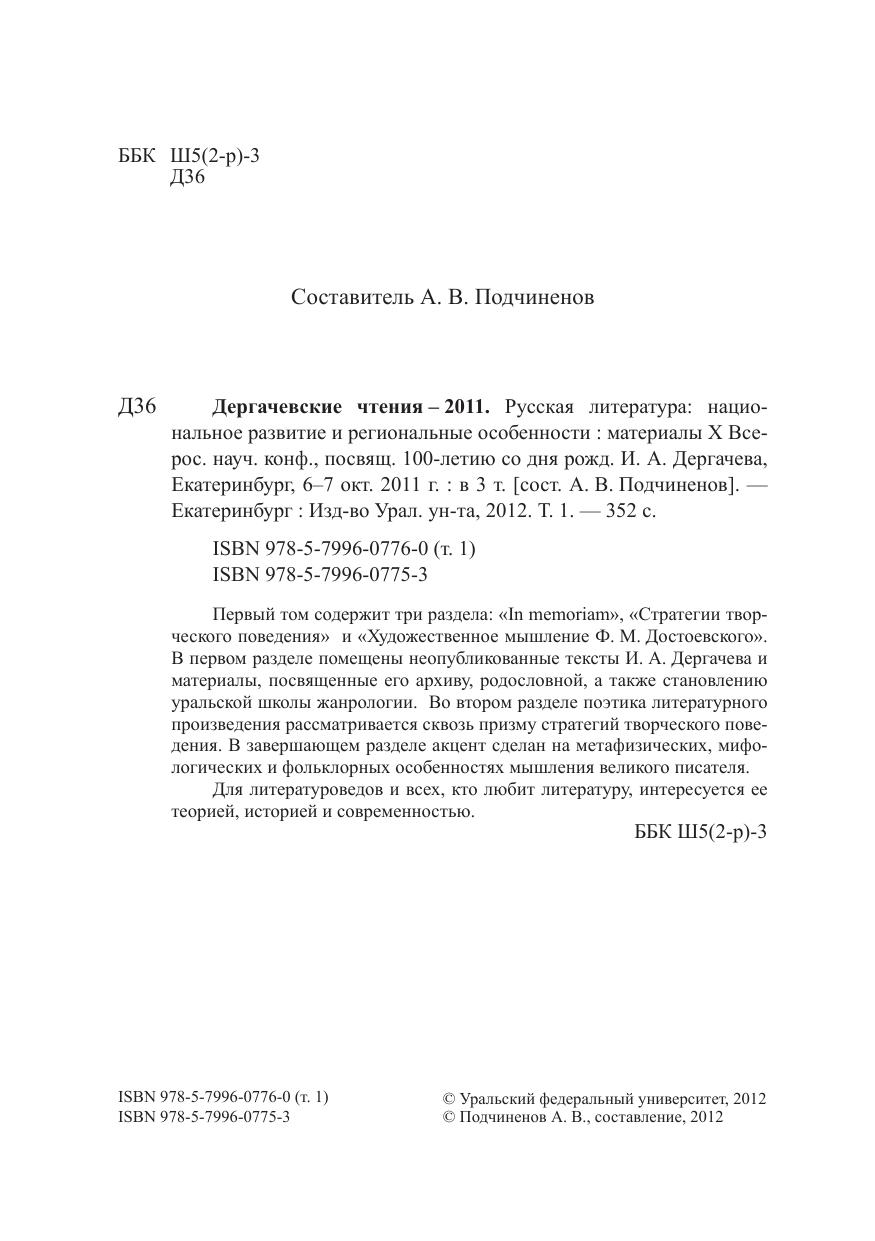 Дергачевские чтения – 2011 Том 1 Русская литература: национальное развитие и региональные особенности : материалы X всерос. науч. конф., посвящ. 100-летию со дня рожд. И. А. Дергачева, Екатеринбург, 6–7 окт. 2011 г.