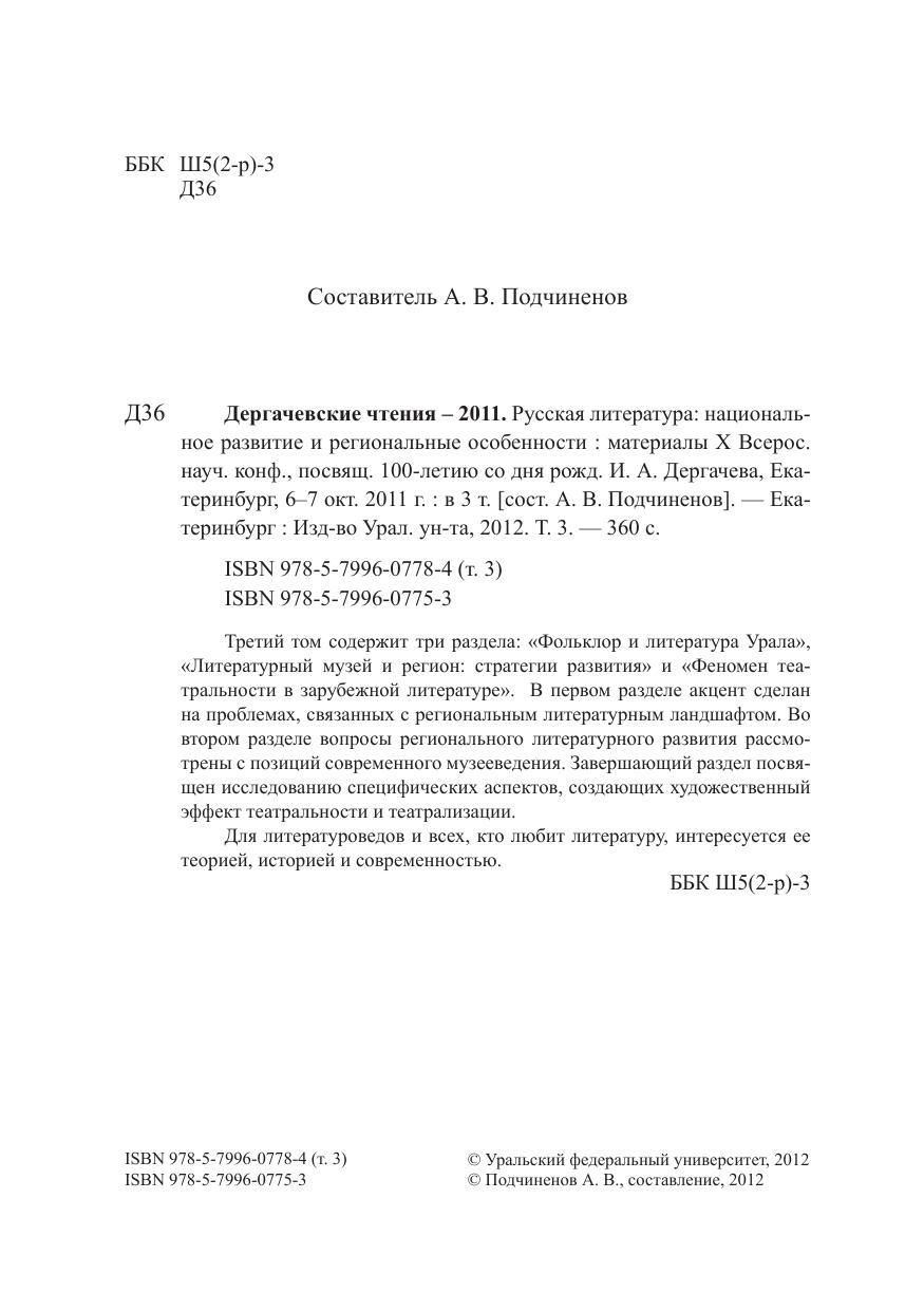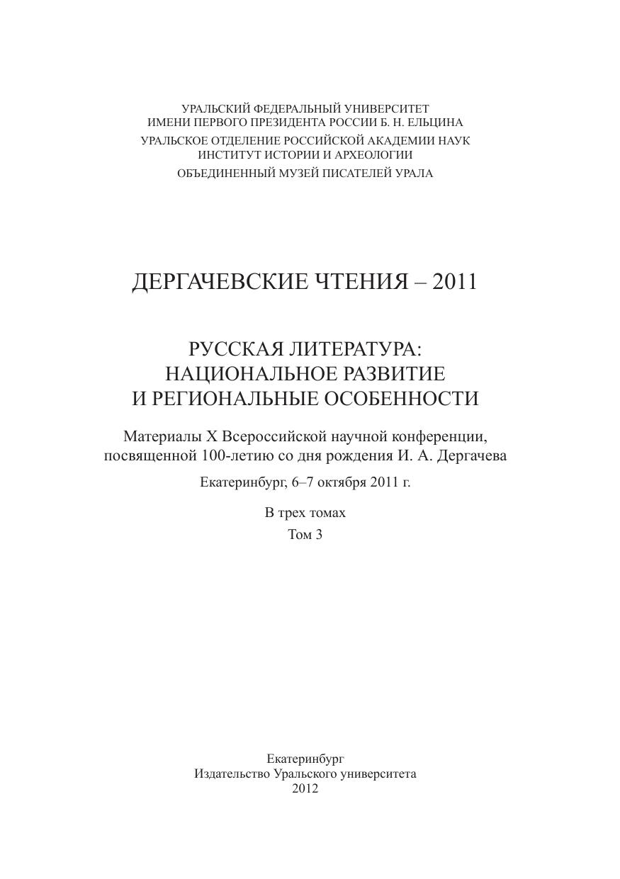 Дергачевские чтения – 2011 Том 3 Русская литература: национальное развитие и региональные особенности: материалы X всерос. науч. конф., посвящ. 100-летию со дня рожд. И. А. Дергачева, Екатеринбург, 6–7 окт. 2011 г.