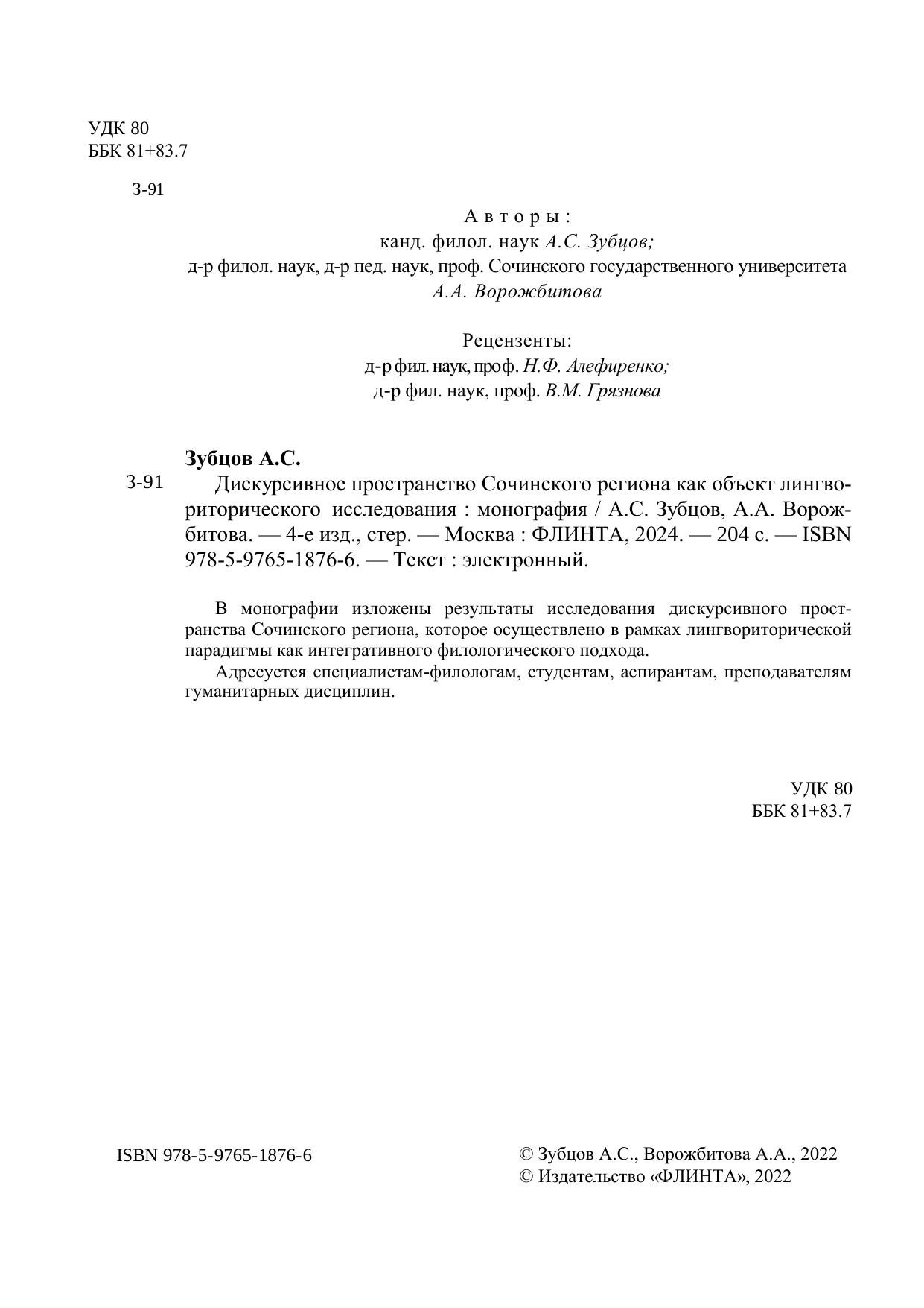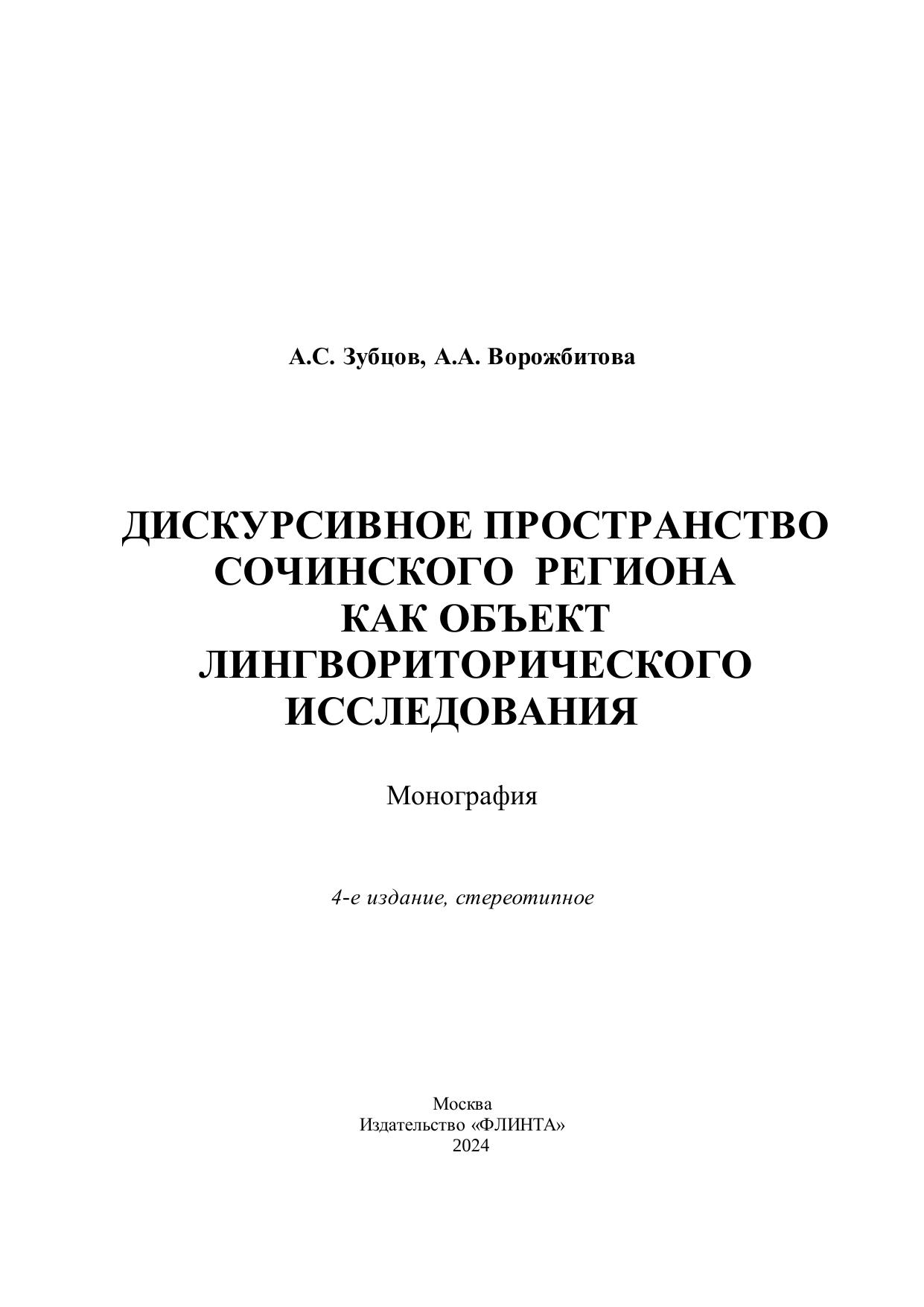 В монографии изложены результаты исследования дискурсивного пространства Сочинского региона, которое осуществлено в рамках лингвориторической парадигмы как интегративного филологического подхода. Адресуется специалистам-филологам, студентам, аспирантам, преподавателям гуманитарных дисциплин.