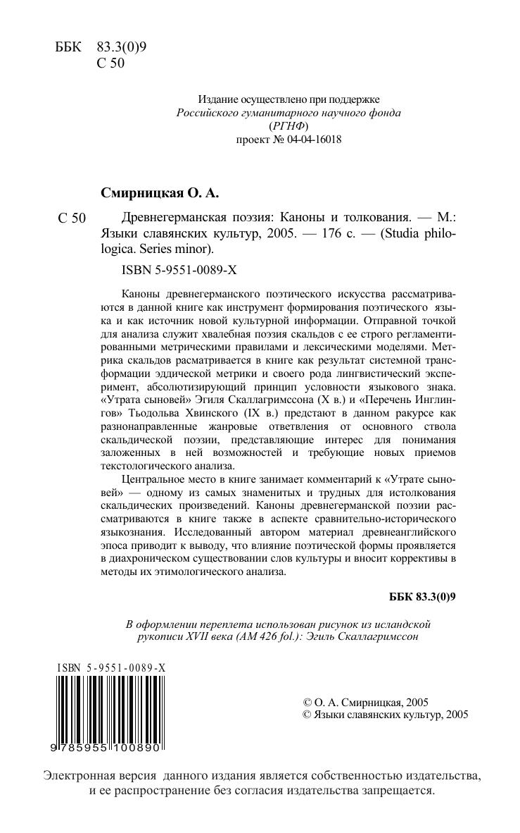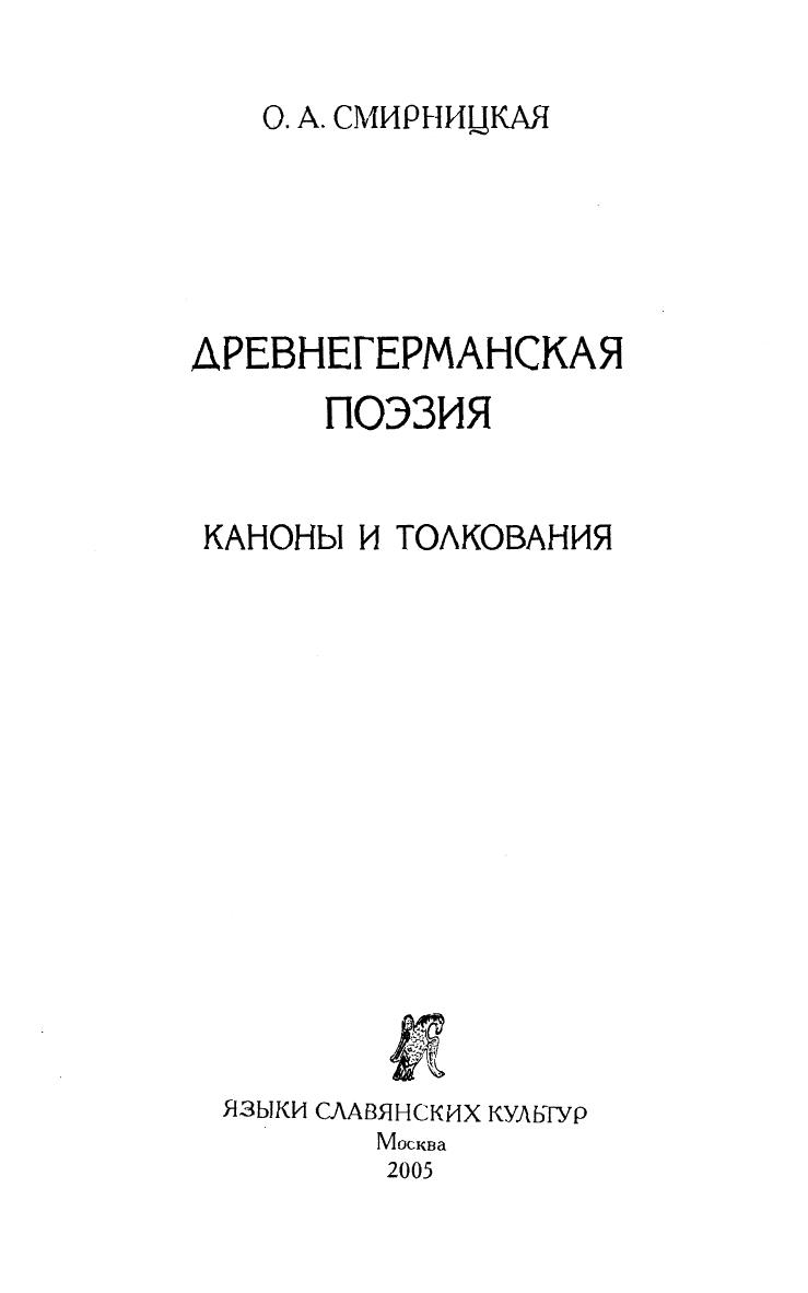 Каноны древнегерманского поэтического искусства рассматриваются в данной книге как инструмент формирования поэтического языка и как источник новой культурной информации. Отправной точкой для анализа служит хвалебная поэзия скальдов с ее строго регламентированными метрическими правилами и лексическими моделями. Метрика скальдов рассматривается в книге как результат системной трансформации эддической метрики и своего рода лингвистический эксперимент, абсолютизирующий принцип условности языкового знака. «Утрата сыновей» Эгиля Скаллагримссона (X в.) и «Перечень Инглингов» Тьодольва Хвинского (IX в.) предстают в данном ракурсе как разнонаправленные жанровые ответвления от основного ствола скальдической поэзии, представляющие интерес для понимания заложенных в ней возможностей и требующие новых приемов текстологического анализа. Центральное место в книге занимает комментарий к «Утрате сыновей» – одному из самых знаменитых и трудных для истолкования скальдических произведений. Каноны древнегерманской поэзии рассматриваются в книге также в аспекте сравнительно-исторического языкознания. Исследованный автором материал древнеанглийского эпоса приводит к выводу, что влияние поэтической формы проявляется в диахроническом существовании слов культуры и вносит коррективы в методы их этимологического анализа.