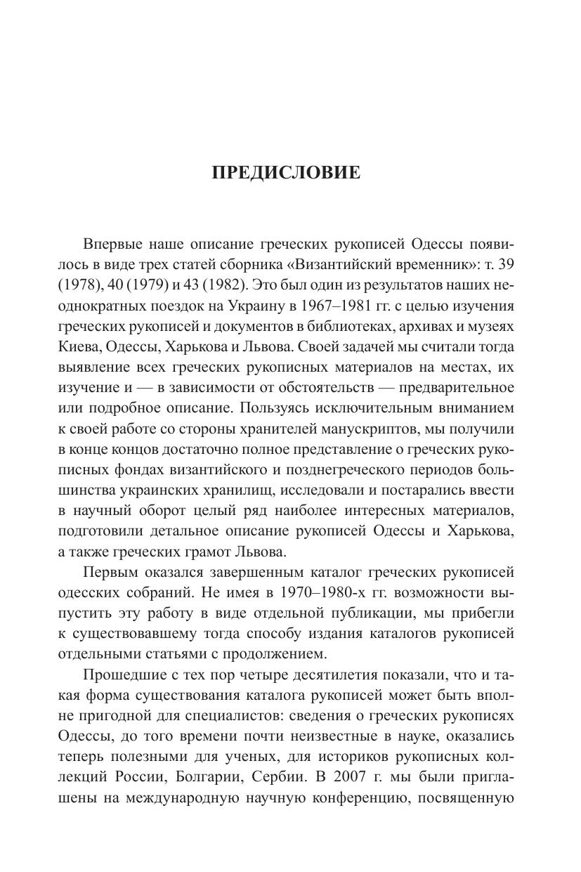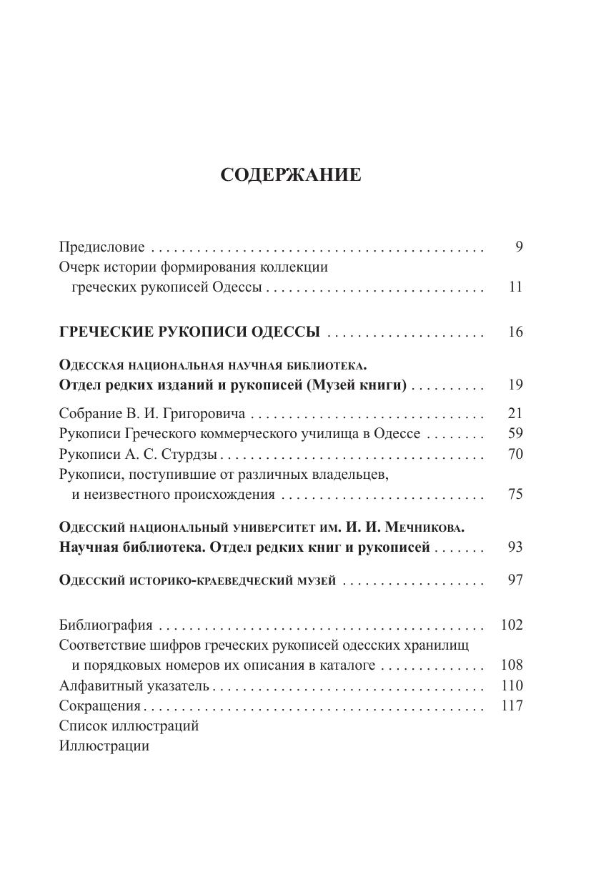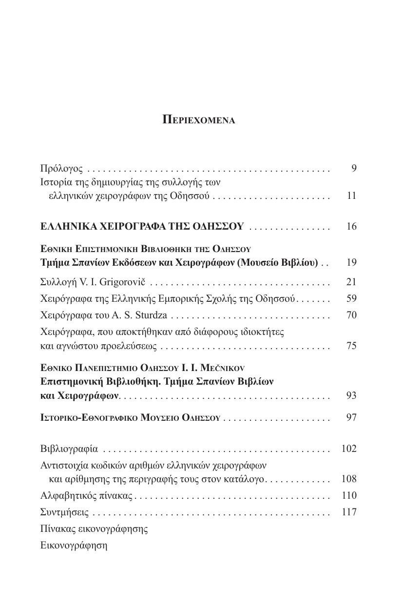 Каталог включает в себя описание 37 греческих рукописей X ‒ нач. XX в., хранящихся в Одесской национальной научной библиотеке (35 ед. хр.), Одесском национальном университете им. И. И. Мечникова (1 ед. хр.) и Одесском историко-краеведческом музее (1 ед. хр.). Описанию манускриптов предшествует исторический очерк греческого рукописного фонда Одессы, основанный на исследовании как самих рукописных книг, так и всех относящихся к ним документов библиотек и архивов Одессы, Москвы и Санкт-Петербурга.