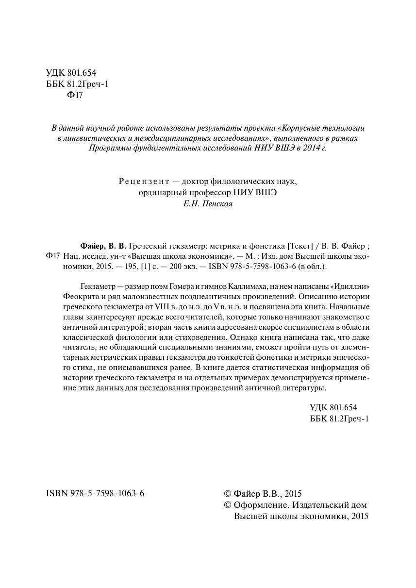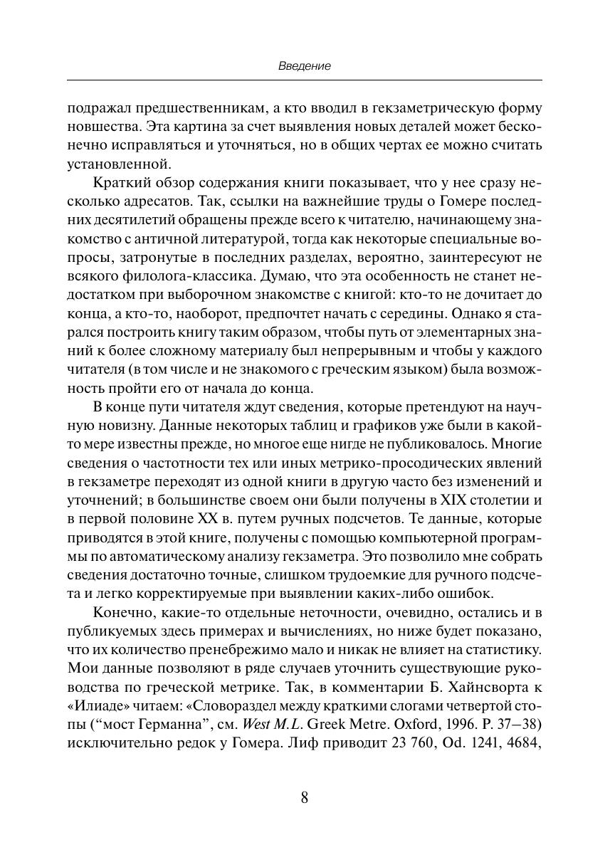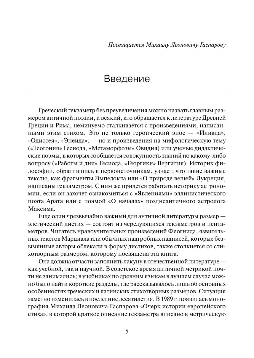 Гекзаметр — размер поэм Гомера и гимнов Каллимаха, на нем написаны «Идиллии» Феокрита и ряд малоизвестных позднеантичных произведений. Описанию истории греческого гекзаметра от VIII в. до н.э. до V в. н.э. и посвящена эта книга. Начальные главы заинтересуют прежде всего читателей, которые только начинают знакомство с античной литературой; вторая часть книги адресована скорее специалистам в об ласти классической филологии или стиховедения. Однако книга написана так, что даже читатель, не обладающий специальными знаниями, сможет пройти путь от элементарных метрических правил гекзаметра до тонкостей фонетики и метрики эпического стиха, не описывавшихся ранее. В книге дается статистическая информация об истории греческого гекзаметра и на отдельных примерах демонстрируется применение этих данных для исследования произведений античной литературы.