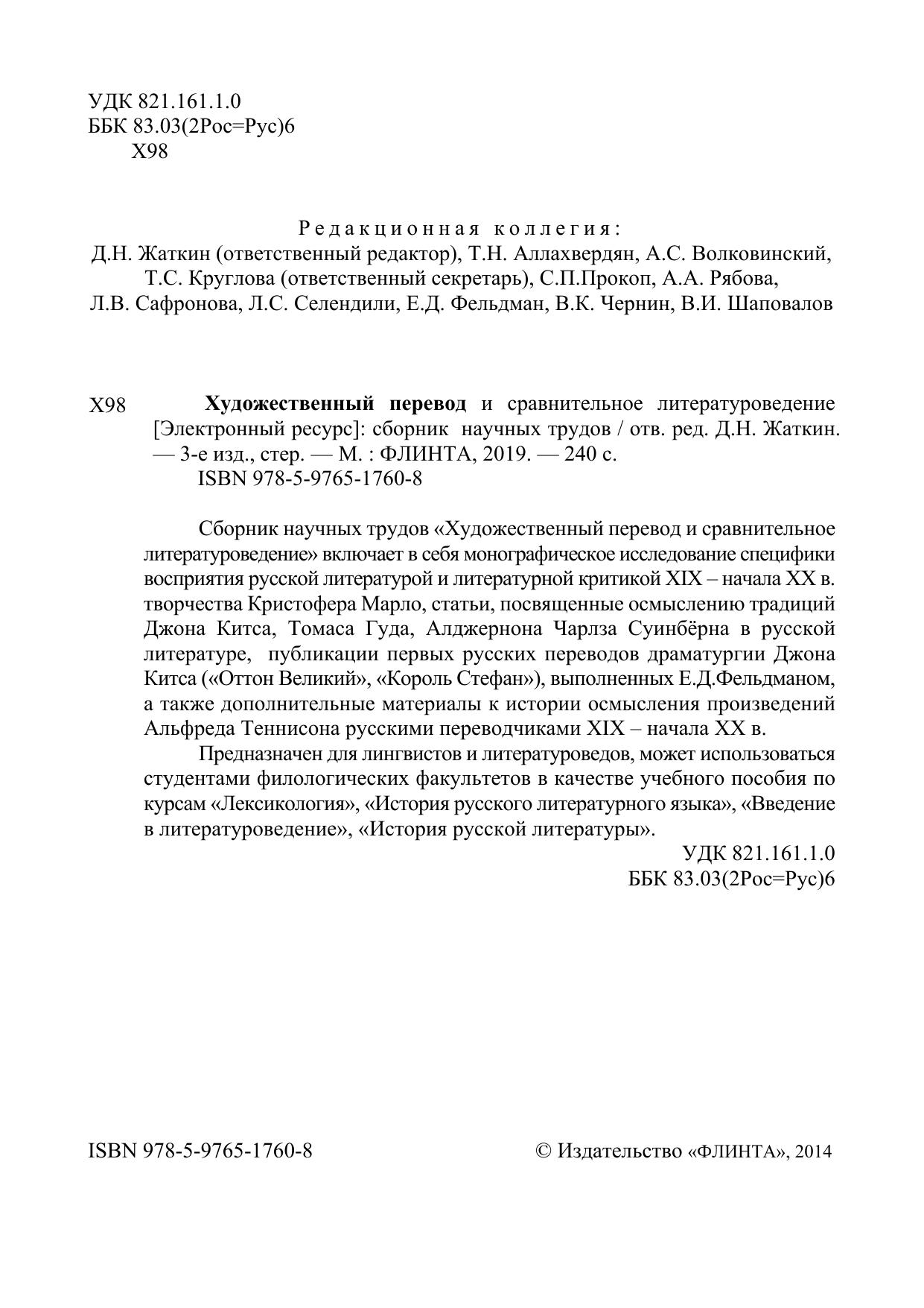 Сборник научных трудов «Художественный перевод и сравнительное литературоведение» включает в себя монографическое исследование специфики восприятия русской литературой и литературной критикой XIX – начала XX в. творчества Кристофера Марло, статьи, посвященные осмыслению традиций Джона Китса, Томаса Гуда, Алджернона Чарлза Суинбёрна в русской литературе, публикации первых русских переводов драматургии Джона Китса («Оттон Великий», «Король Стефан»), выполненных Е.Д.Фельдманом, а также дополнительные материалы к истории осмысления произведений Альфреда Теннисона русскими переводчиками XIX – начала XX в. Предназначен для лингвистов и литературоведов, может использоваться студентами филологических факультетов в качестве учебного пособия по курсам «Лексикология», «История русского литературного языка», «Введение в литературоведение», «История русской литературы».