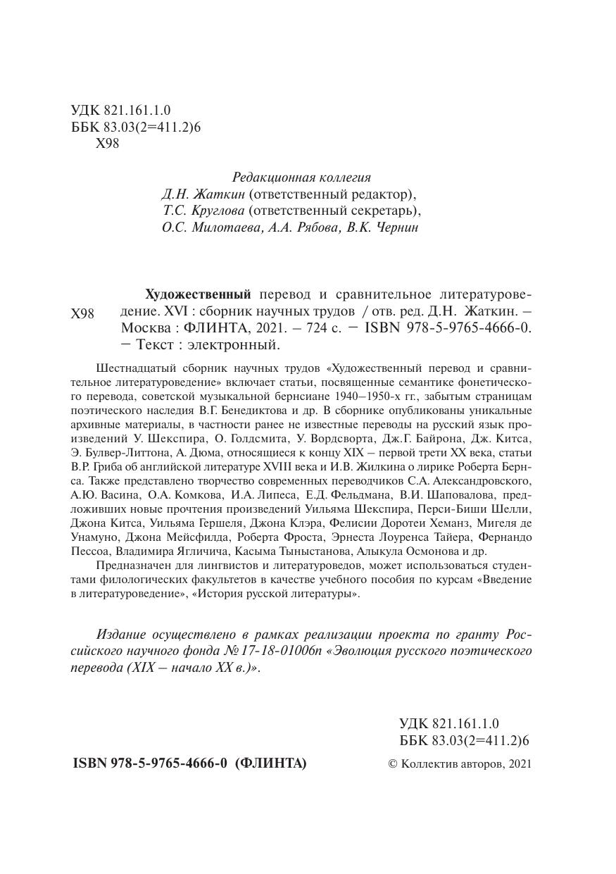 Шестнадцатый сборник научных трудов «Художественный перевод и сравнительное литературоведение» включает статьи, посвященные семантике фонетического перевода, советской музыкальной бернсиане 1940–1950-х годов, забытым страницам поэтического наследия В.Г. Бенедиктова и др. В сборнике опубликованы уникальные архивные материалы, в частности ранее не известные переводы на русский язык произведений У. Шекспира, О. Голдсмита, У. Вордсвор-
