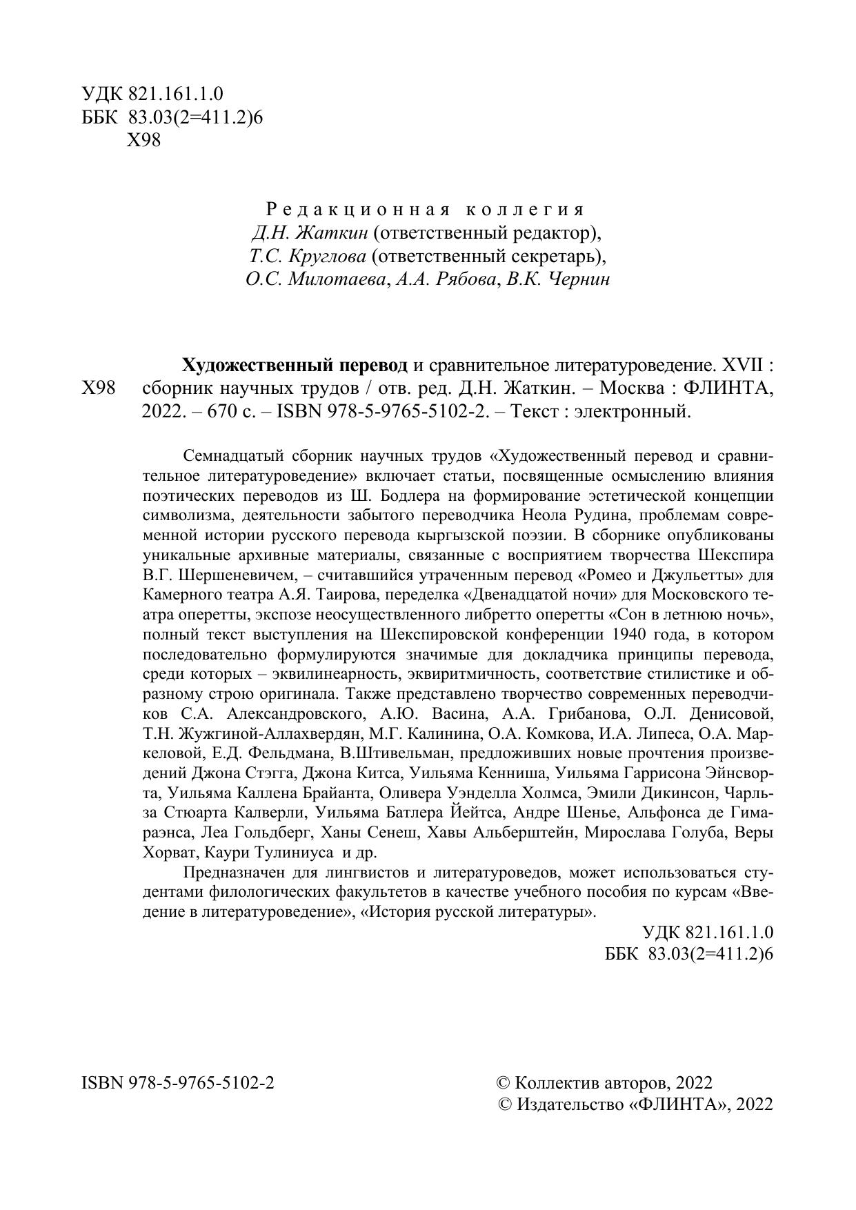 Семнадцатый сборник научных трудов «Художественный перевод и сравнительное литературоведение» включает статьи, посвященные осмыслению влияния поэтических переводов из Ш. Бодлера на формирование эстетической концепции символизма, деятельности забытого переводчика Неола Рудина, проблемам современной истории русского перевода кыргызской поэзии. В сборнике опубликованы уникальные архивные материалы, связанные с восприятием творчества Шекспира В.Г. Шершеневичем, – считавшийся утраченным перевод «Ромео и Джульетты» для Камерного театра А.Я. Таирова, переделка «Двенадцатой ночи» для Московского театра оперетты, экспозе неосуществленного либретто оперетты «Сон в летнюю ночь», полный текст выступления на Шекспировской конференции 1940 года, в котором последовательно формулируются значимые для докладчика принципы перевода, среди которых – эквилинеарность, эквиритмичность, соответствие стилистике и образному строю оригинала. Также представлено творчество современных пере-водчиков С.А. Александровского, А.Ю. Васина, А.А. Грибанова, О.Л. Денисовой, Т.Н. Жужгиной-Аллахвердян, М.Г. Калинина, О.А. Комкова, И.А. Липеса, О.А. Маркеловой, Е.Д. Фельдмана, В.Штивельман, предложивших новые прочтения произведений Джона Стэгга, Джона Китса, Уильяма Кенниша, Уильяма Гаррисона Эйнс-ворта, Уильяма Каллена Брайанта, Оливера Уэнделла Холмса, Эмили Дикинсон, Чарльза Стюарта Калверли, Уильяма Батлера Йейтса, Андре Шенье, Альфонса де Гимараэнса, Леа Гольдберг, Ханы Сенеш, Хавы Альберштейн, Мирослава Голуба, Веры Хорват, Каури Тулиниуса и др.