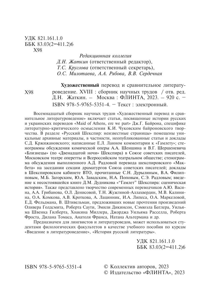 Восемнадцатый сборник научных трудов «Художественный перевод и сравнительное литературоведение» включает статьи, посвященные истории русских и украинских переводов «Maid of Athens, ere we part» Дж.Г. Байрона, специфике литературно-критического осмысления К.И. Чуковским байроновского творчества. В разделе «Русский Шекспир: неизвестные страницы» помещены уникальные архивные материалы, в частности, неопубликованные статьи и доклады С.Д. Кржижановского; написанные Е.Л. Ланном комментарии к «Гамлету»; стенограммы обсуждения комической оперы А.А. Шеншина и В.Г. Шершеневича «Близнецы» (по «Двенадцатой ночи» Шекспира) в Союзе советских писателей, Московском театре оперетты и Всероссийском театральном обществе; стенограмма обсуждения выполненного А.Д. Радловой перевода шекспировского «Макбета» на заседании секции драматургов Союза советских писателей; доклады в Шекспировском кабинете ВТО, прочитанные С.Н. Дурылиным, В.А. Филипповым, М.Б. Загорским, Ю.А. Завадским, Н.А. Поповым, С.Э. Радловым; введение к несостоявшейся книге Д.М. Дудникова «“Гамлет” Шекспира: сценическая история». Также представлено творчество современных переводчиков А.Ю. Васина, А.А. Грибанова, О.Л. Денисовой, Т.Н. Жужгиной-Аллахвердян, М.В. Калинина, О.А. Комкова, А.В. Кроткова, А. Лацинник, И.А. Липеса, О.А. Маркеловой, Е.Д. Фельдмана, предложивших новые прочтения произведений Оливера Голдсмита, Роберта Саути, Эмили Дикинсон, Сэмюэла Батлера, Уильяма Швенка Гилберта, Хоакина Миллера, Джорджа Уильяма Расселла, Роберта Фроста, Дилана Томаса, Анатоля Франса, Натана Альтермана и др.