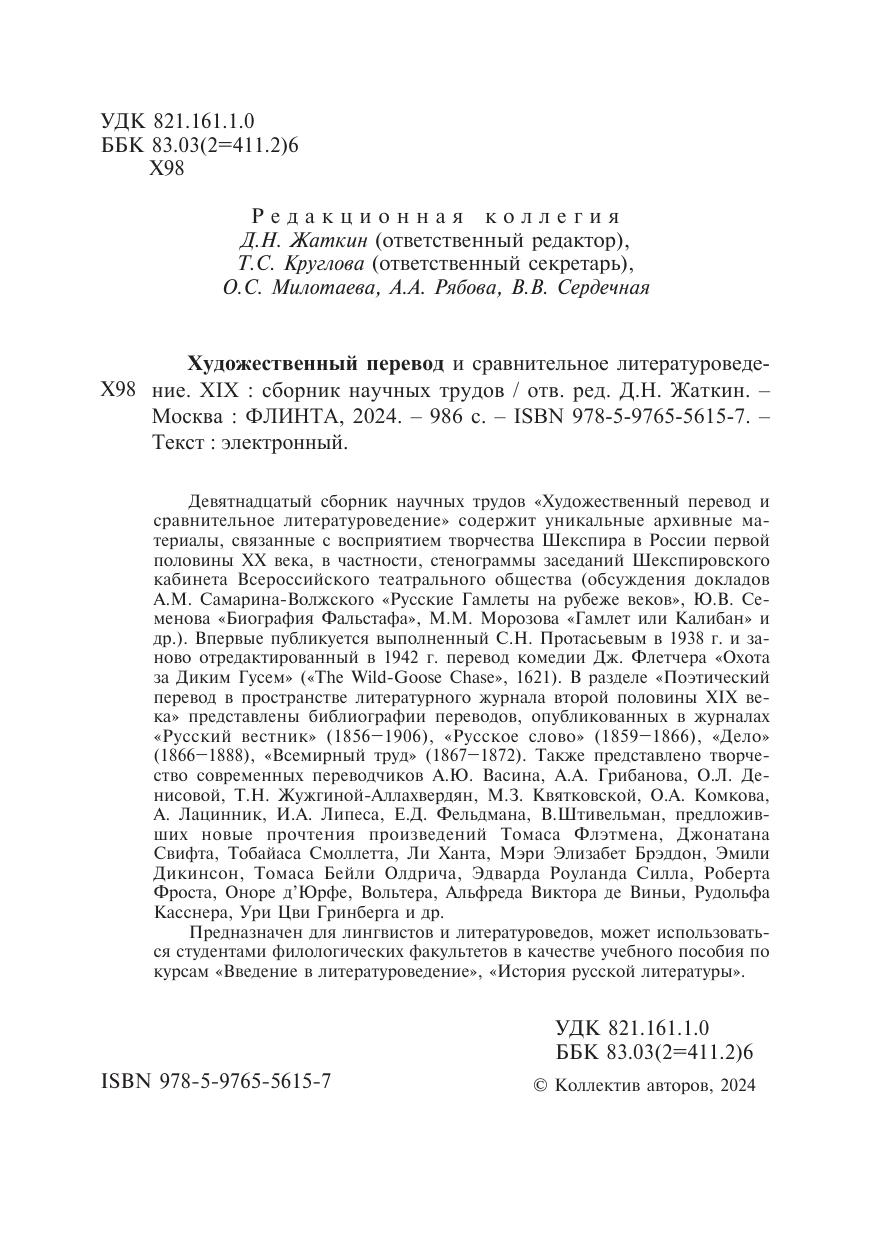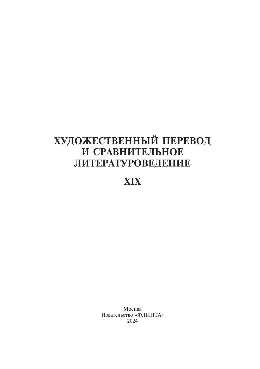 Девятнадцатый сборник научных трудов «Художественный перевод и сравнительное литературоведение» содержит уникальные архивные материалы, связанные с восприятием творчества Шекспира в России первой половины XX века, в частности, стенограммы заседаний Шекспировского кабинета Всероссийского театрального общества (обсуждения докладов А.М. Самарина-Волжского «Русские Гамлеты на рубеже веков», Ю.В. Семенова «Биография Фальстафа», М.М. Морозова «Гамлет или Калибан» и др.). Впервые публикуется выполненный С.Н. Протасьевым в 1938 г. и заново отредактированный в 1942 г. перевод комедии Дж. Флетчера «Охота за Диким Гусем» («The Wild-Goose Chase», 1621). В разделе «Поэтический перевод в пространстве литературного журнала второй половины XIX века» представлены библиографии переводов, опубликованных в журналах «Русский вестник» (1856–1906), «Русское слово» (1859–1866), «Дело» (1866–1888), «Всемирный труд» (1867–1872). Также представлено творчество современных переводчиков А.Ю. Васина, А.А. Грибанова, О.Л. Денисовой, Т.Н. Жужгиной-Аллахвердян, М.З. Квятковской, О.А. Комкова, А. Лацинник, И.А. Липеса, Е.Д. Фельдмана, В.Штивельман, предложивших новые прочтения произведений Томаса Флэтмена, Джонатана Свифта, Тобайаса Смоллетта, Ли Ханта, Мэри Элизабет Брэддон, Эмили Дикинсон, Томаса Бейли Олдрича, Эдварда Роуланда Силла, Роберта Фроста, Оноре д’Юрфе, Вольтера, Альфреда Виктора де Виньи, Рудольфа Касснера, Ури Цви Гринберга и др. Предназначен для лингвистов и литературоведов, может использоваться студентами филологических факультетов в качестве учебного пособия по курсам «Введение в литературоведение», «История русской литературы».