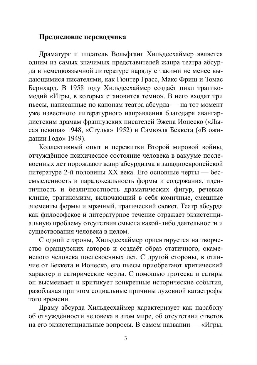 Драматург и писатель Вольфганг Хильдесхаймер является одним из самых значимых представителей жанра театра абсурда в немецкоязычной литературе наряду с такими не менее выдающимися писателями, как Гюнтер Грасс, Макс Фриш и Томас Бернхард. «Игры, в которых становится темно» — цикл трагикомедий, в который вошли три пьесы, написанные по канонам театра абсурда.