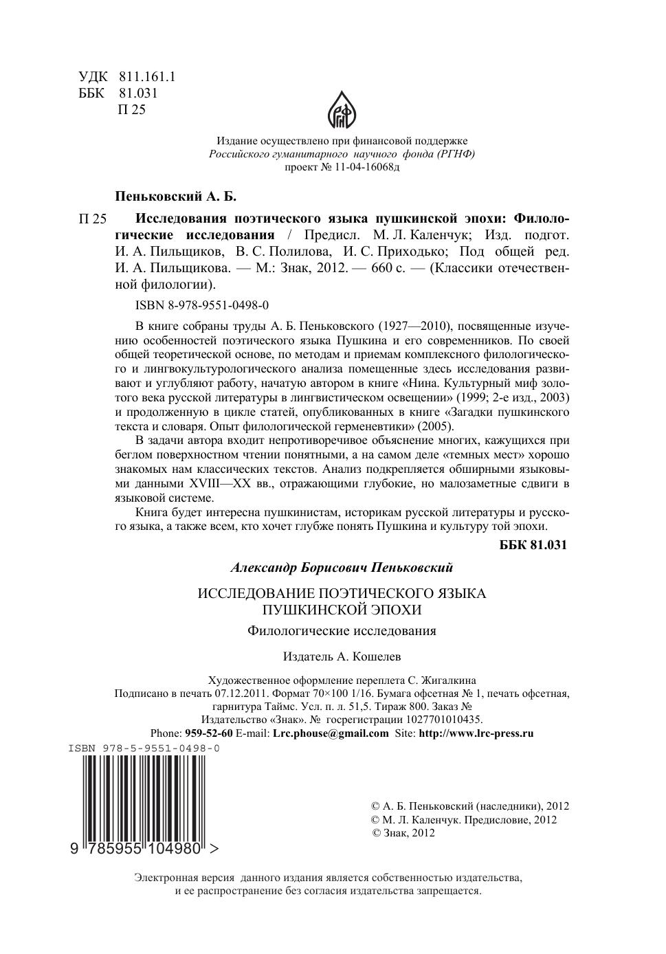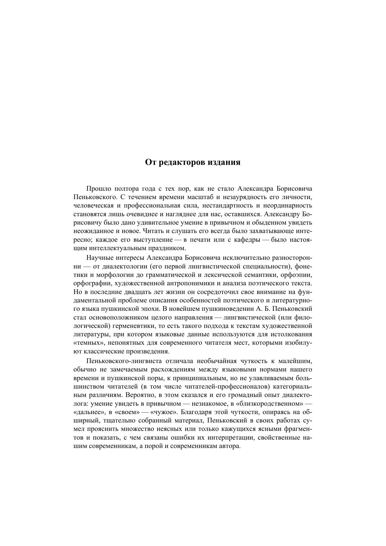 В книге собраны труды А. Б. Пеньковского (1927–2010), посвященные изучению особенностей поэтического языка Пушкина и его современников. По своей общей теоретической основе, по методам и приемам комплексного филологического и лингвокультурологического анализа помещенные здесь исследования развивают и углубляют работу, начатую автором в книге «Нина. Культурный миф золотого века русской литературы в лингвистическом освещении» (1999, 2-е изд., 2003) и продолженную в цикле статей, опубликованных в книге «Загадки пушкинского текста и словаря. Опыт филологической герменевтики» (2005). В задачи автора входит непротиворечивое объяснение многих, кажущихся при беглом поверхностном чтении понятными, а на самом деле «темных мест» хорошо знакомых нам классических текстов. Анализ подкрепляется обширными языковыми данными XVIII–XX вв., отражающими глубокие, но малозаметные сдвиги в языковой системе. Книга будет интересна пушкинистам, историкам русской литературы и русского языка, а также всем, кто хочет глубже понять Пушкина и культуру той эпохи.