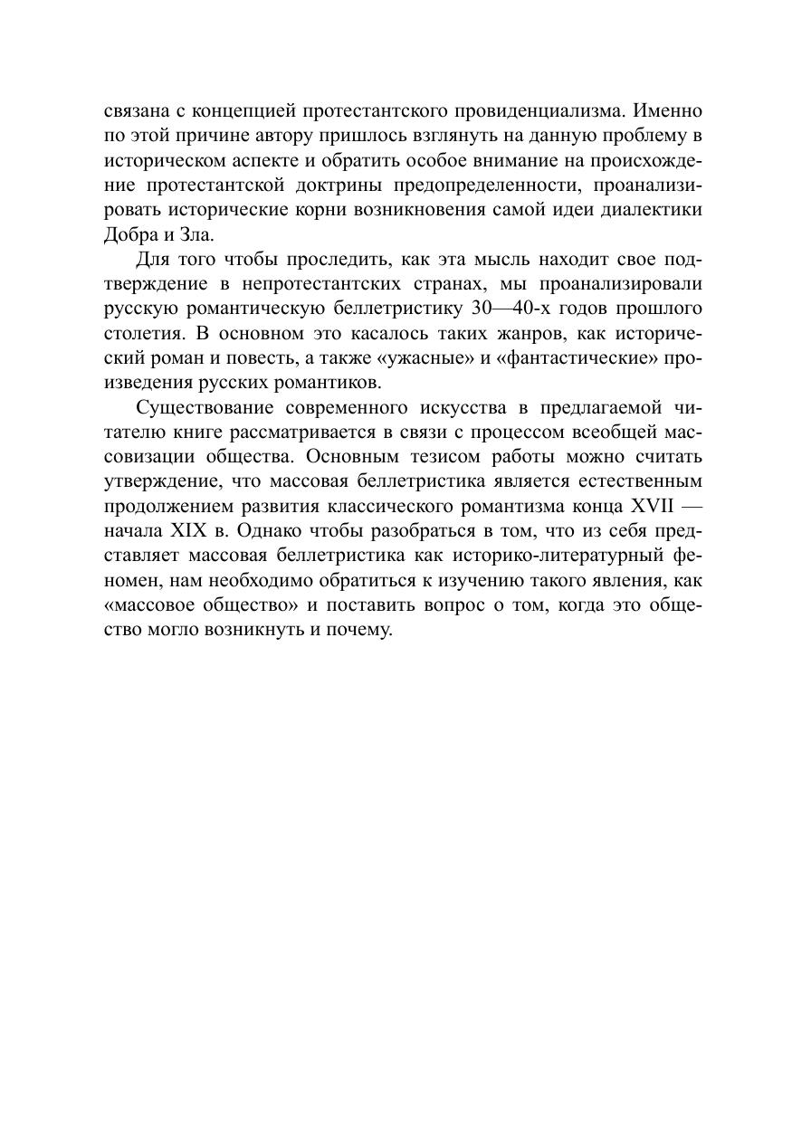 В основу книги положена гипотеза о романтическом происхождении таких жанров массовой беллетристики, как исторический роман, роман ужаса, «фэнтези» и детектив, утверждается, что так называемая диалектика Добра и Зла, лежащая в основе всей романтической эстетики, непосредственно связана с концепцией протестантского провиденциализма. Данная проблема рассматривается в историческом аспекте, особое внимание обращено на происхождение протестантской доктрины предопределенности, анализируются исторические корни возникновения самой идеи диалектики Добра и Зла.