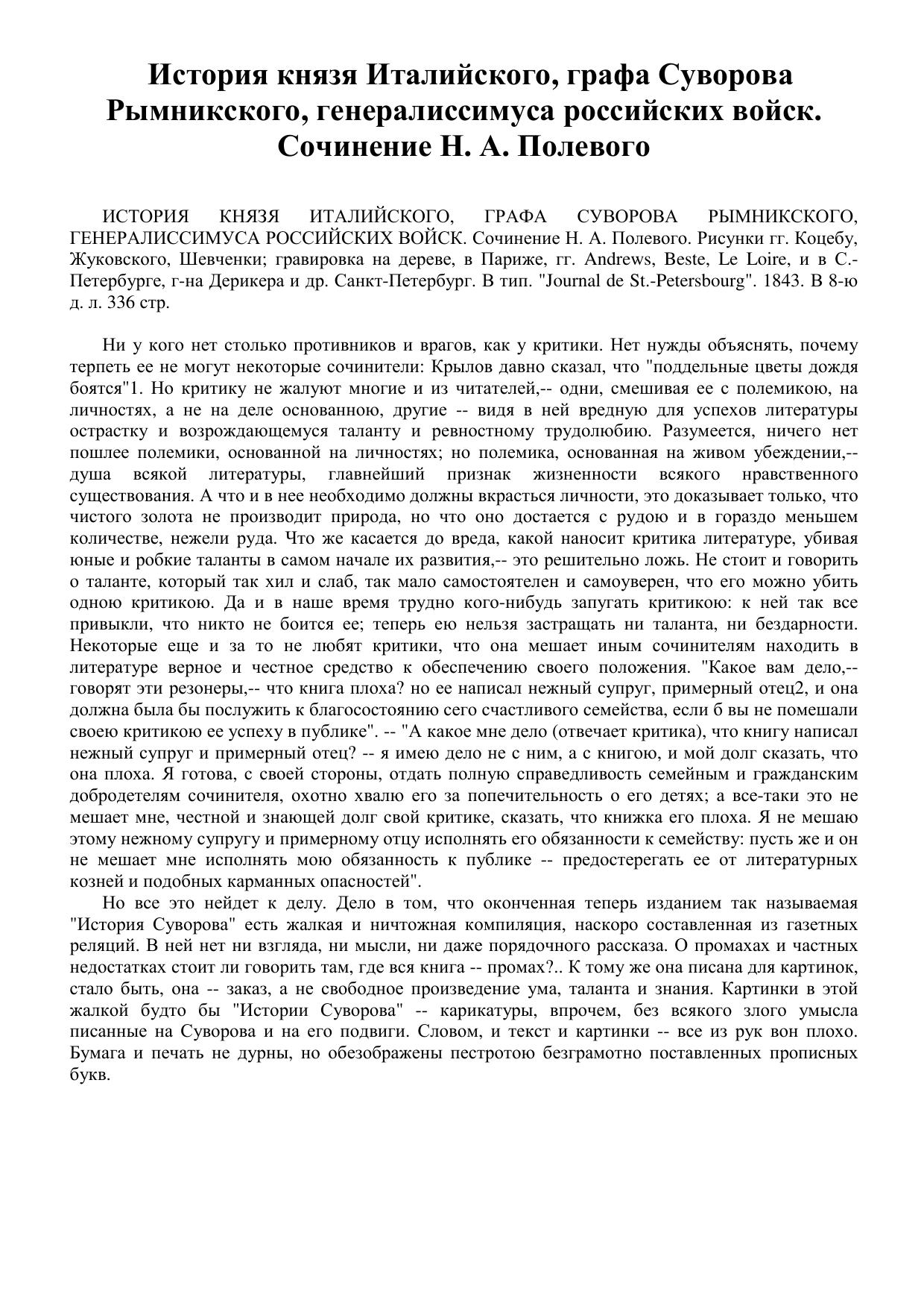 История князя Италийского, графа Суворова Рымникского, генералиссимуса российских войск. Сочинение Н. А. Полевого