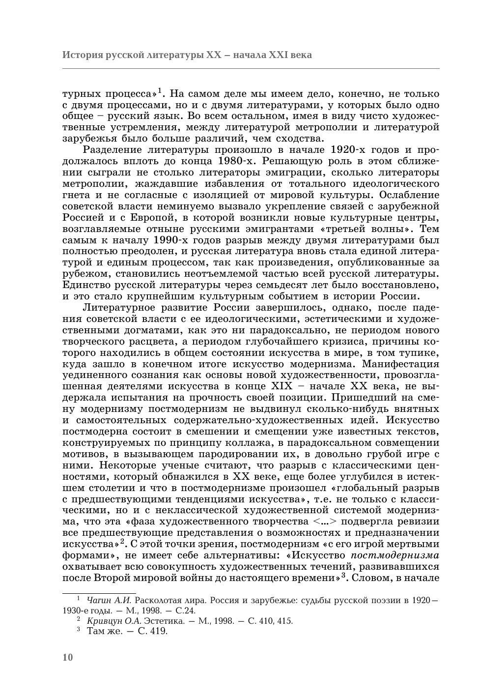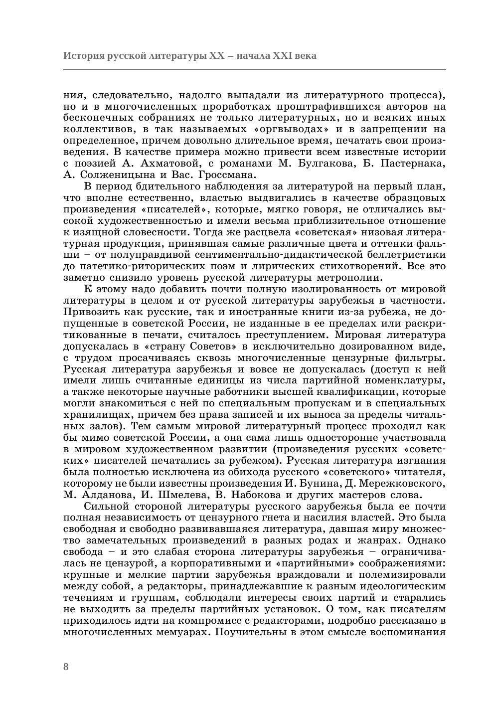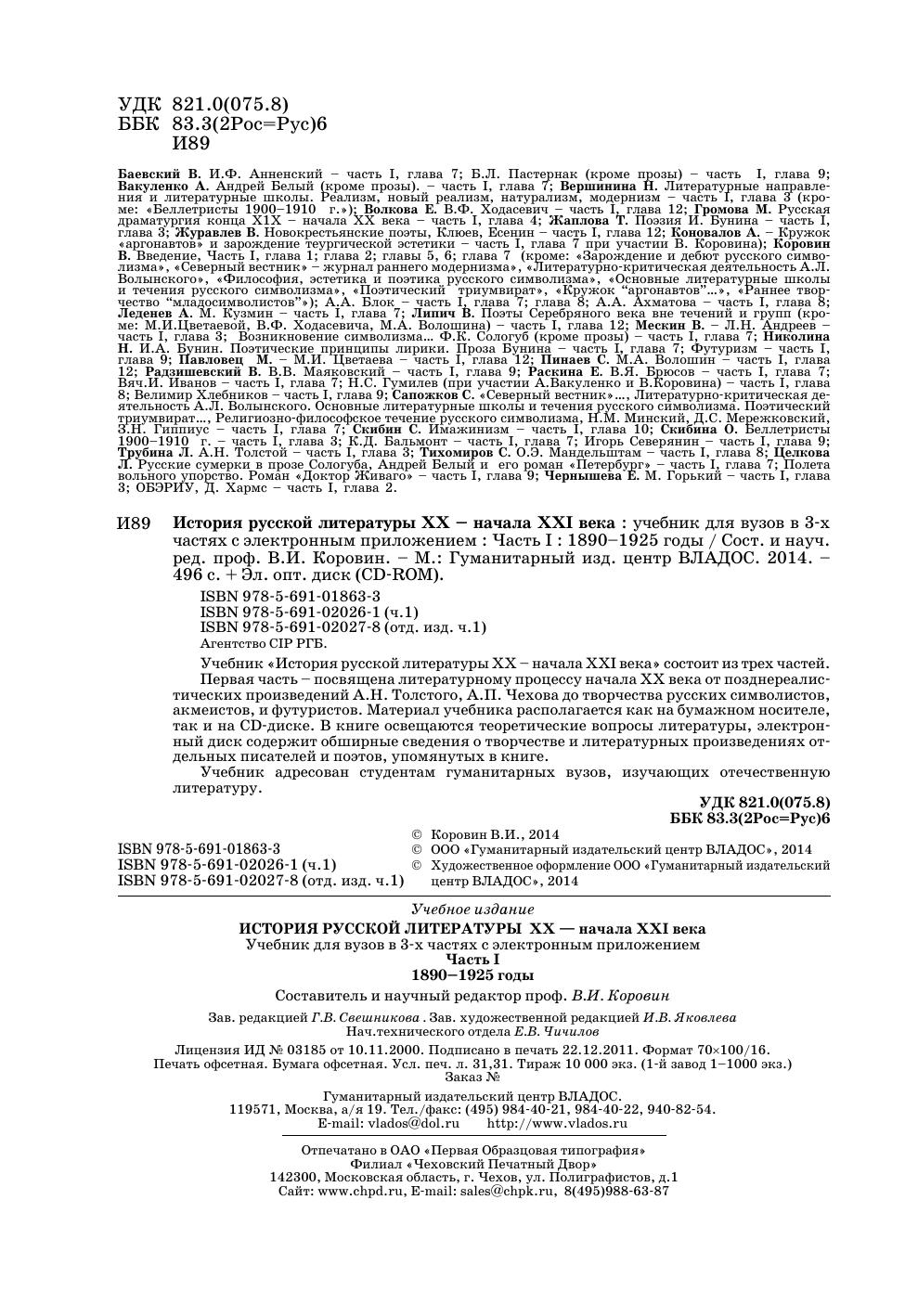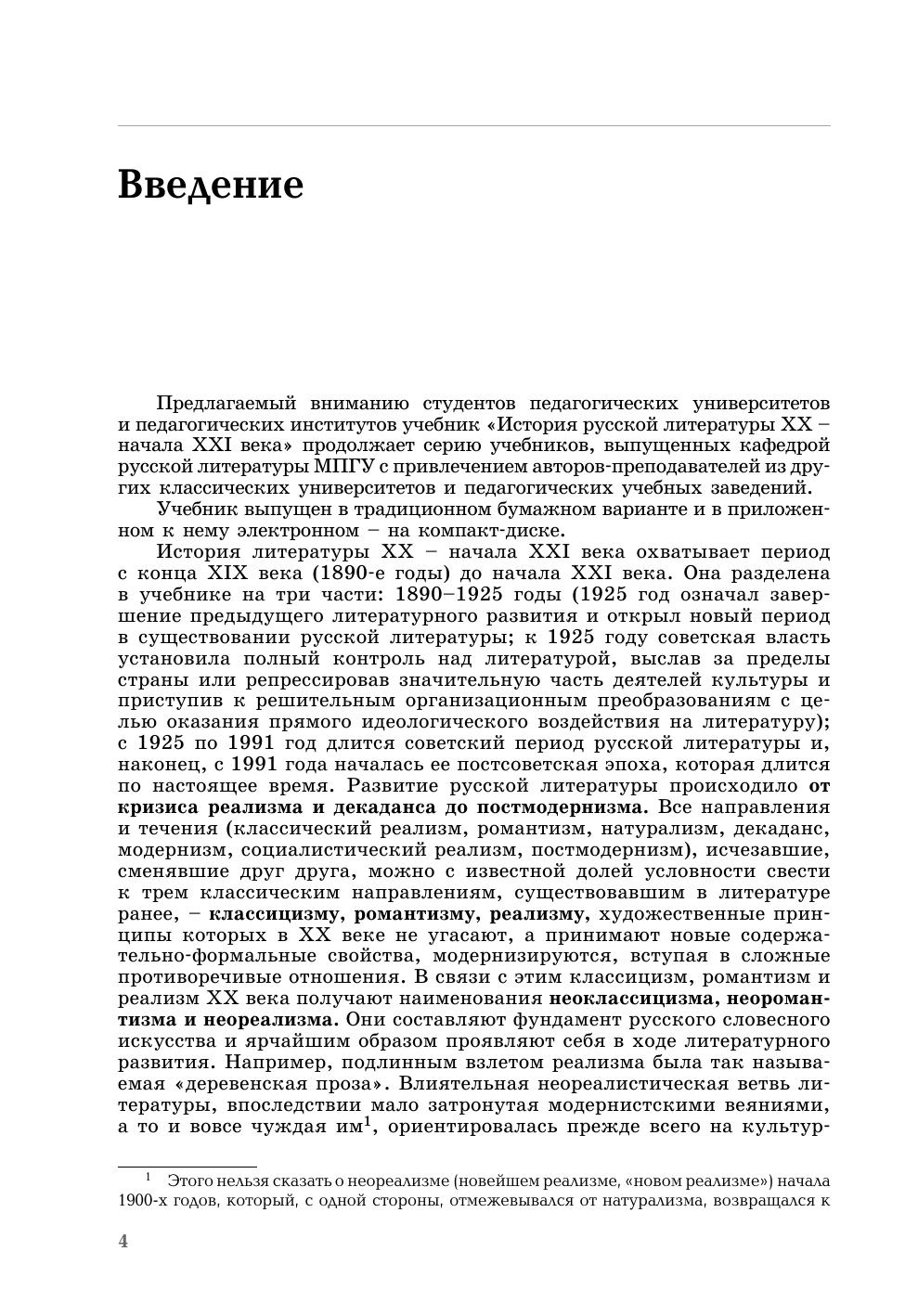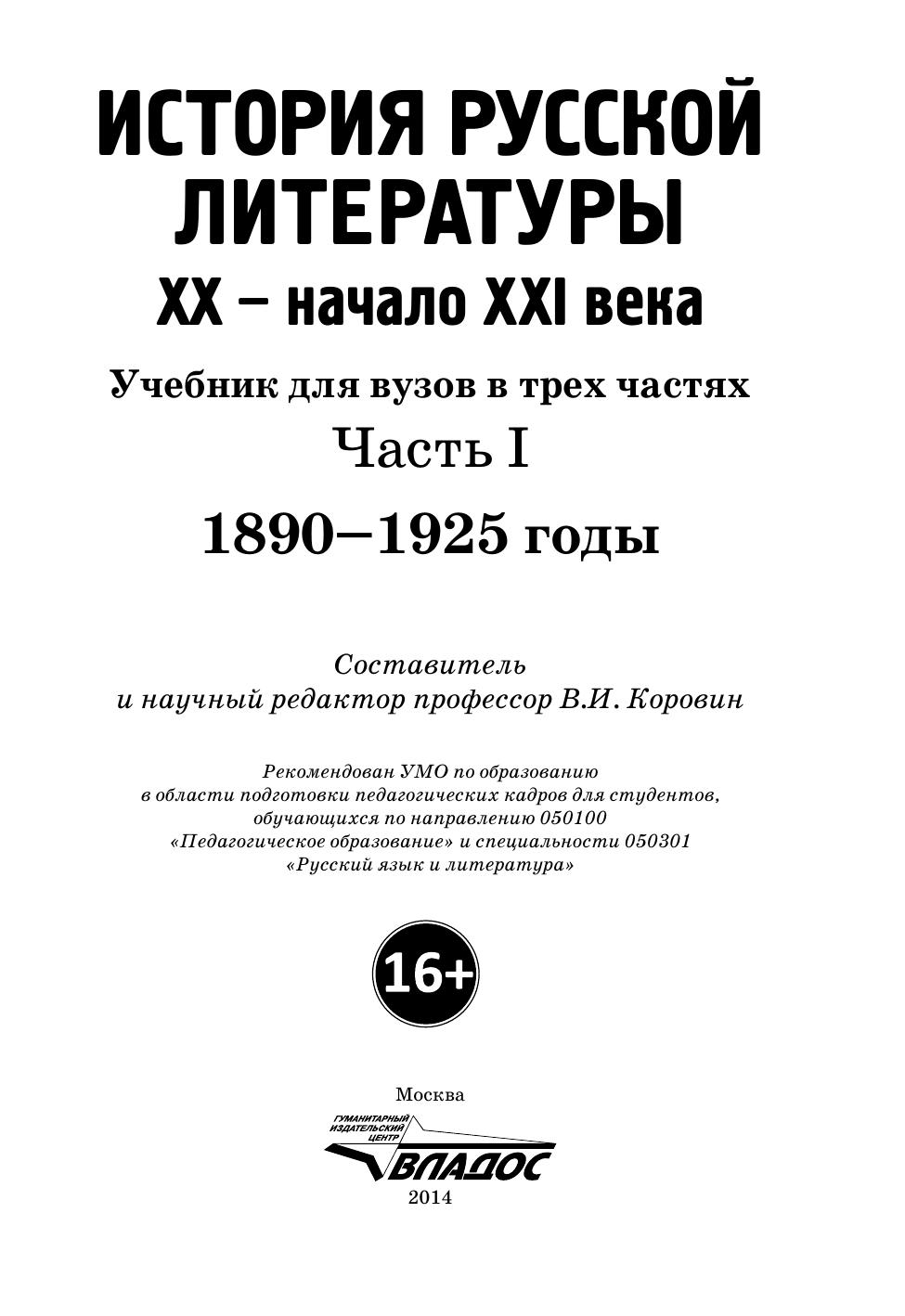Учебник «История русской литературы XX – начала XXI века» состоит из трех частей. Первая часть – посвящена литературному процессу начала XX века от позднереалистических произведений А.Н. Толстого, А.П. Чехова до творчества русских символистов, акмеистов, и футуристов. Материал учебника располагается как на бумажном носителе, так и на CD-диске. В книге освещаются теоретические вопросы литературы, электронный диск содержит обширные сведения о творчестве и литературных произведениях отдельных писателей и поэтов, упомянутых в книге. Учебник адресован студентам гуманитарных вузов, изучающих отечественную литературу.