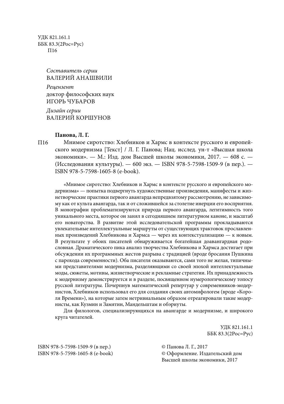 «Мнимое сиротство: Хлебников и Хармс в контексте русского и европейского модернизма» — попытка подвергнуть художественные произведения, манифесты и жизнетворческие практики первого авангарда непредвзятому рассмотрению, не зависимому как от культа авангарда, так и от сложившейся за столетие инерции его восприятия. В монографии проблематизируются природа первого авангарда, легитимность того уникального места, которое он занял в сегодняшнем литературном каноне, и масштаб его новаторства. В развитие этой исследовательской программы прокладываются увлекательные интеллектуальные маршруты от существующих трактовок прославленных произведений Хлебникова и Хармса — через их контекстуализацию — к новым. В результате у обоих писателей обнаруживается богатейшая доавангардная родословная. Драматического пика анализ творчества Хлебникова и Хармса достигает при обсуждении их программных жестов разрыва с традицией (вроде бросания Пушкина с парохода современности). оба писателя оказываются, сами того не желая, типичными представителями модернизма, разделяющими со своей эпохой интеллектуальные моды, сюжеты, мотивы, жизнетворческие и рекламные стратегии. их принадлежность к модернизму демонстрируется и в разделе, посвященном нумерологическому топосу русской литературы. Почерпнув математический репертуар у современников-модернистов, Хлебников использовал его для создания своих автомифологем (вроде «Короля Времени»), на которые затем нетривиальным образом отреагировали такие модернисты, как Кузмин и Замятин, Мандельштам и обэриуты. Для филологов, специализирующихся на авангарде и модернизме, и широкого круга читателей.