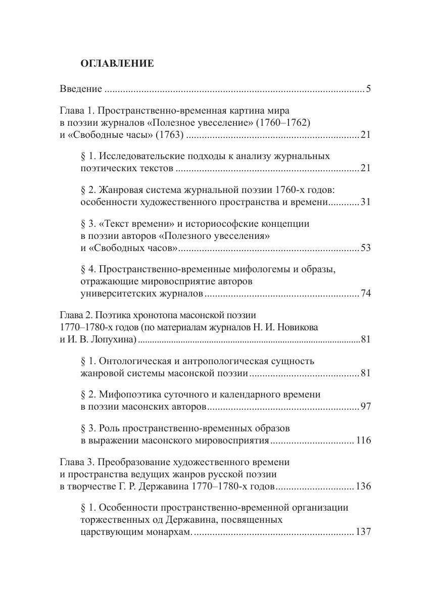 Монография посвящена исследованию пространственно-временных отношений в русской поэзии, представленной в журналах 1760–1780-х гг. и в поэзии Г. Р. Державина 1780-х гг. В работе выявляется роль художественного времени и пространства в процессе изменения принципов изображения действительности и в преобразовании жанровой системы при переходе от классицистического типа мировосприятия к романтическому. Для специалистов в области филологии, культурологии и широкого круга читателей, интересующихся историей русской литературы и культуры.