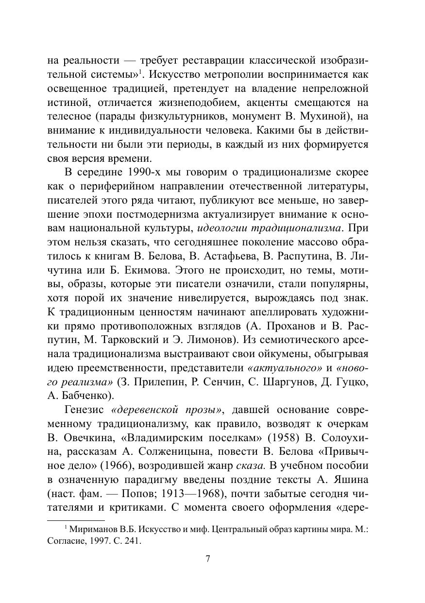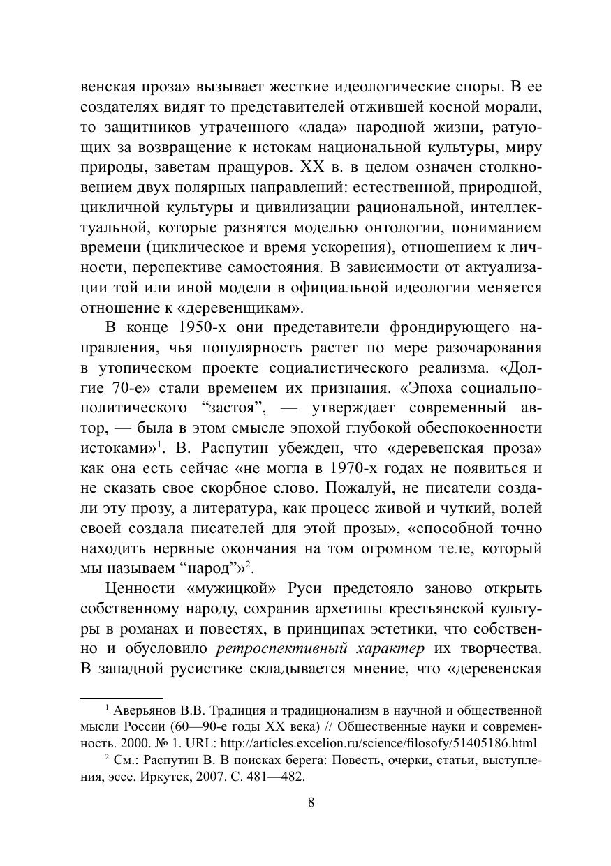 Предлагаемое учебное пособие является обобщающим трудом, дающим системное представление о генезисе, поэтике, историко-культурных и семиотических контекстах, определивших статус одного из ведущих направлений русской прозы XX—XXI вв. В книге традиционалистский тип художественного мышления раскрывается в его типологических характеристиках и индивидуальном своеобразии. Доминанты образной системы рассматриваются как опорные конструкты авторской картины