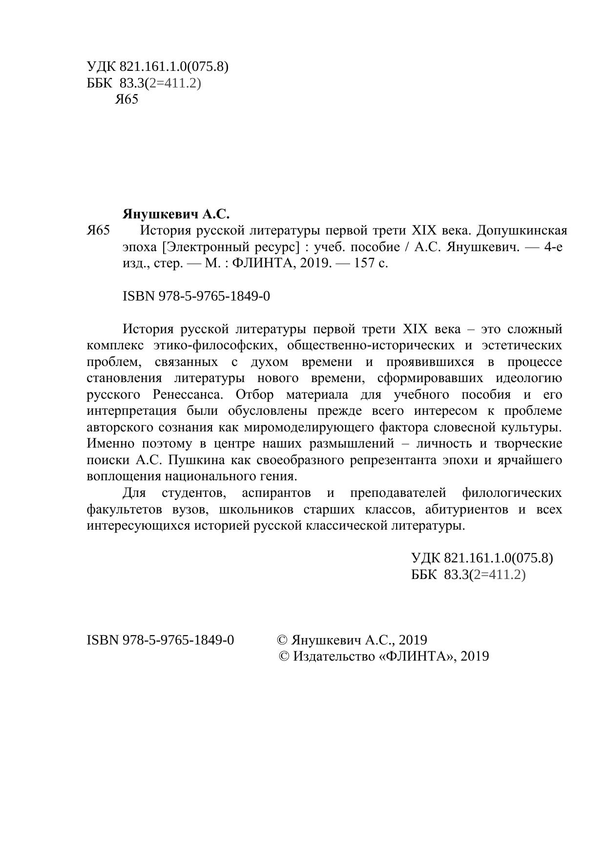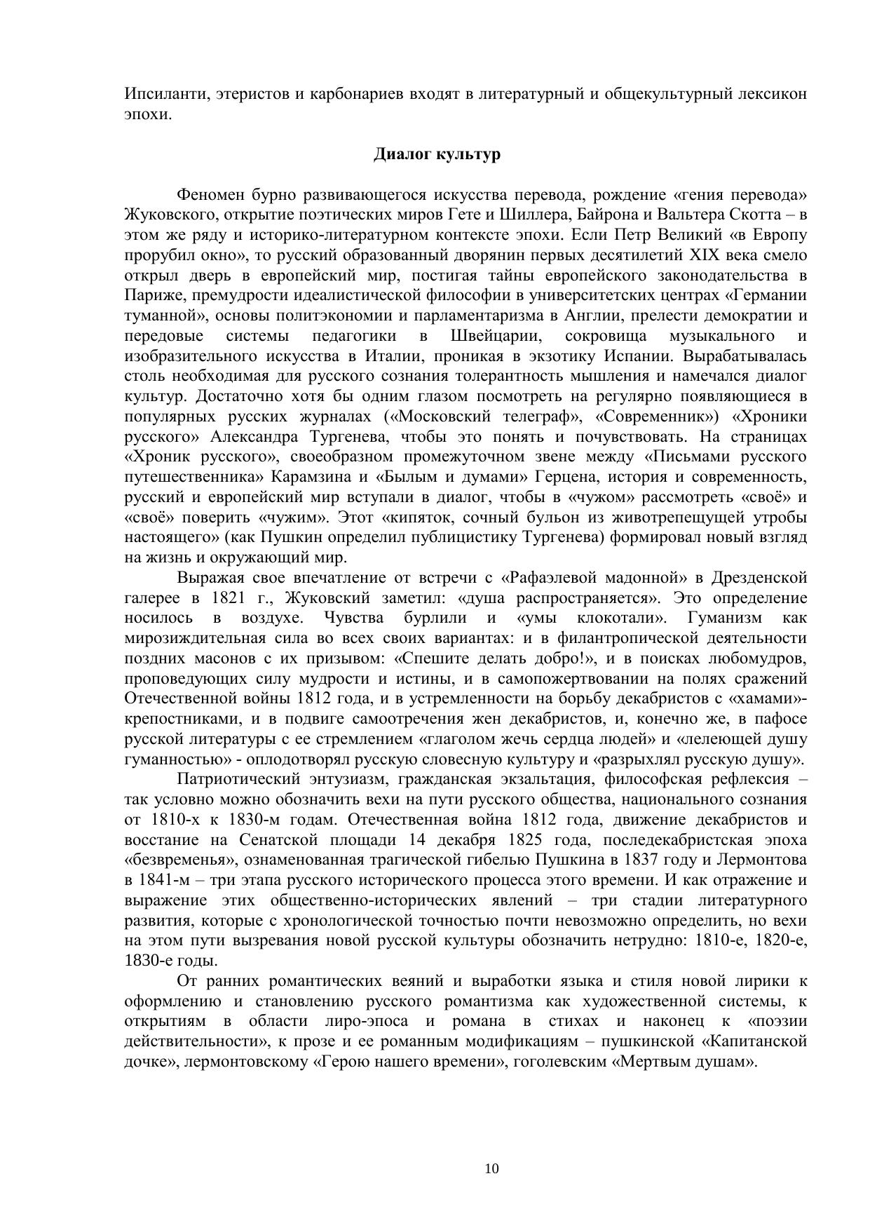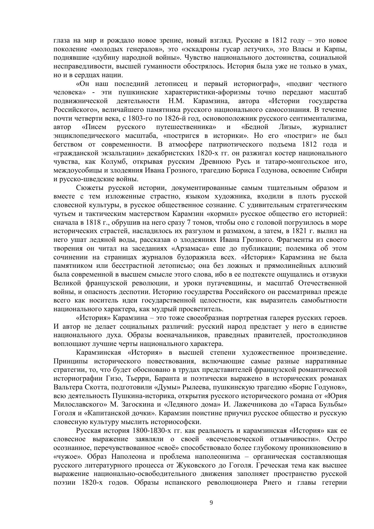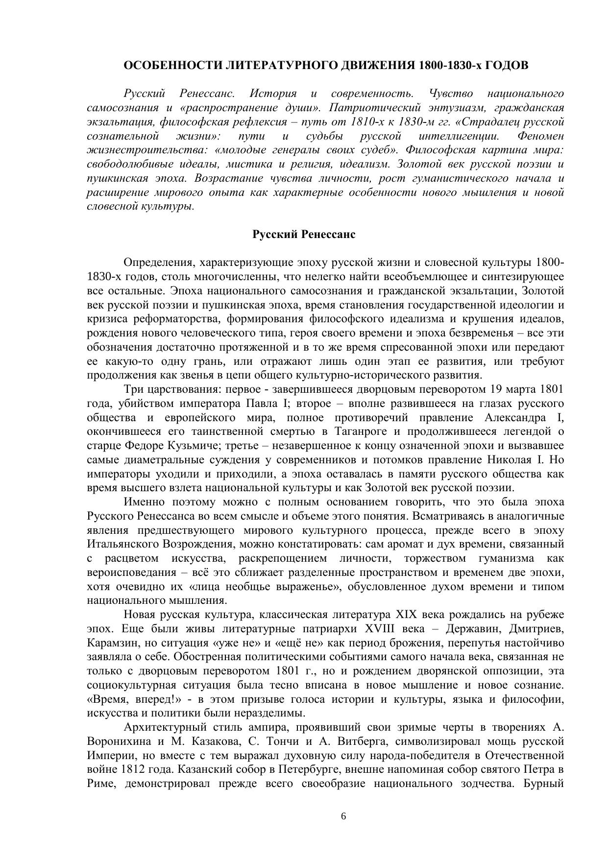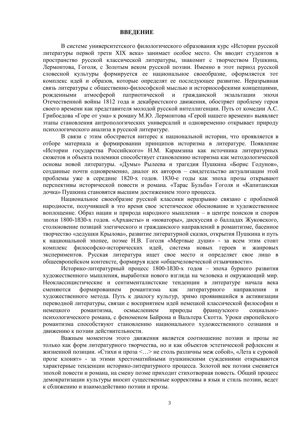История русской литературы первой трети XIX века – это сложный комплекс этико-философских, общественно-исторических и эстетических проблем, связанных с духом времени и проявившихся в процессе становления литературы нового времени, сформировавших идеологию русского Ренессанса. Отбор материала для учебного пособия и его интерпретация были обусловлены прежде всего интересом к проблеме авторского сознания как миромоделирующего фактора словесной культуры. Именно поэтому в центре наших размышлений – личность и творческие поиски А.С. Пушкина как своеобразного репрезентанта эпохи и ярчайшего воплощения национального гения.