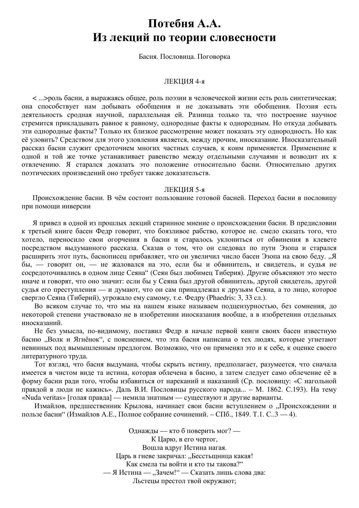 Из лекций по теории словесности: Басня. Пословица. Поговорка