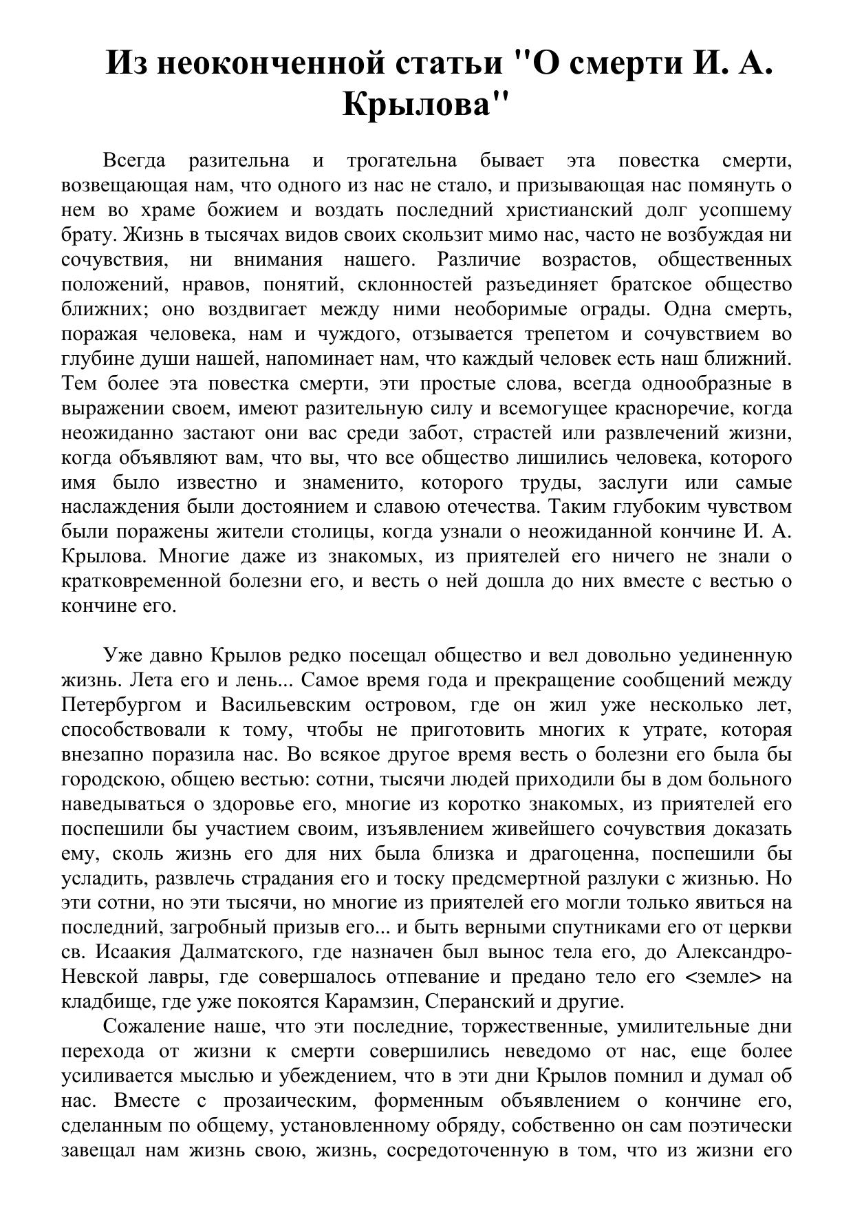 Из неоконченной статьи "О смерти И. А. Крылова"