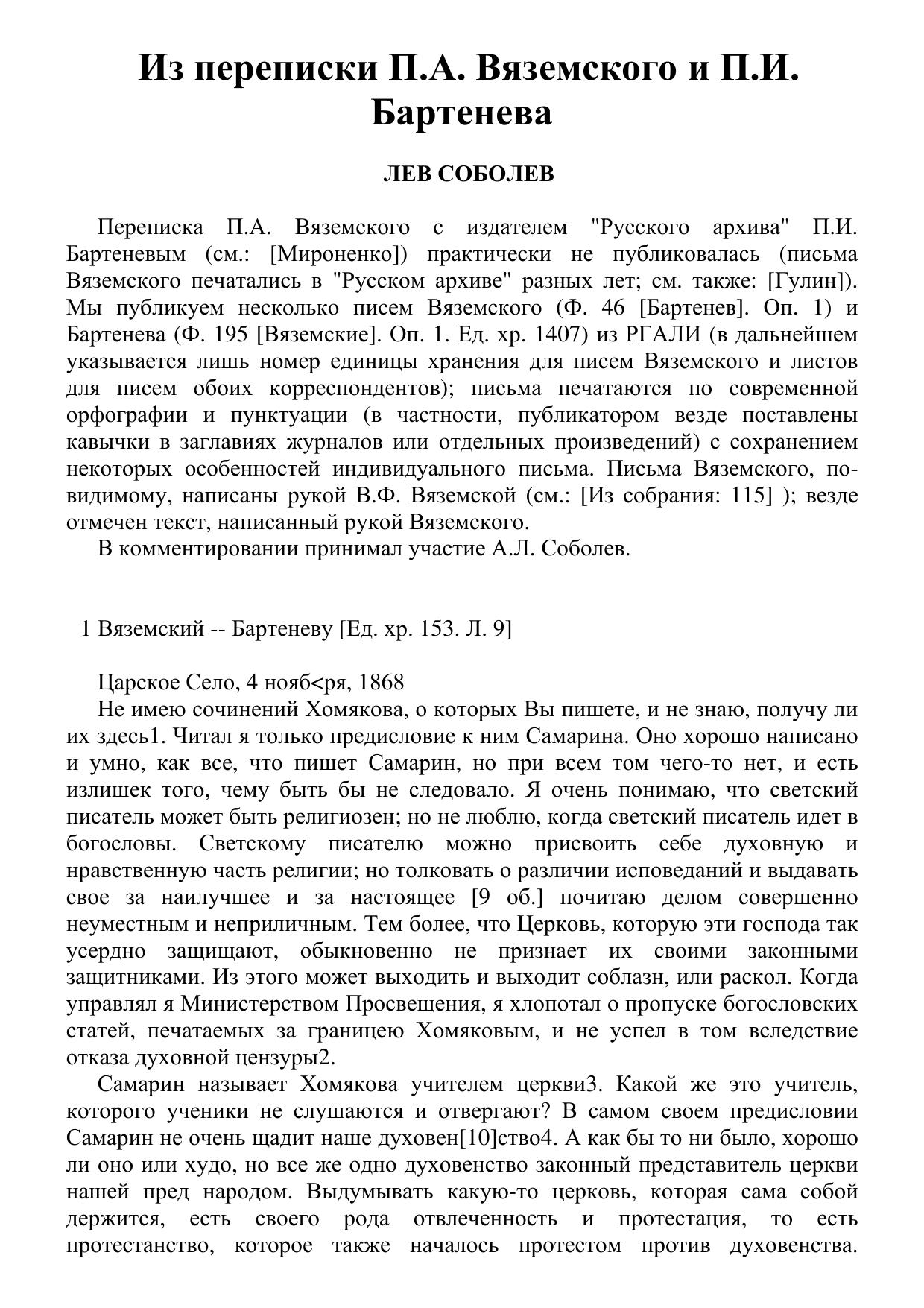 Из переписки П.А. Вяземского и П.И. Бартенева