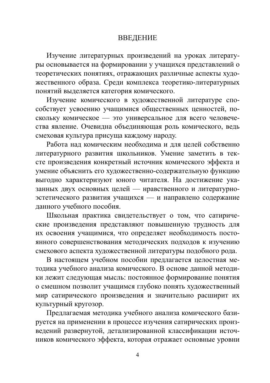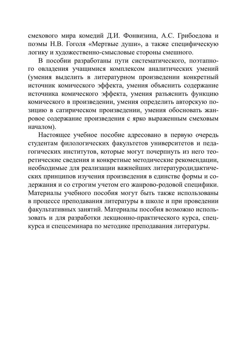 В пособии разработаны пути систематического, поэтапного овладения учащимися комплексом аналитических умений: умения выделить в литературном произведении конкретный источник комического эффекта, умения объяснить содержание источника комического эффекта, умения разъяснить функцию комического в произведении, умения определить авторскую позицию в сатирическом произведении, умения обосновать жанровое содержание произведения с ярко выраженным смеховым началом.