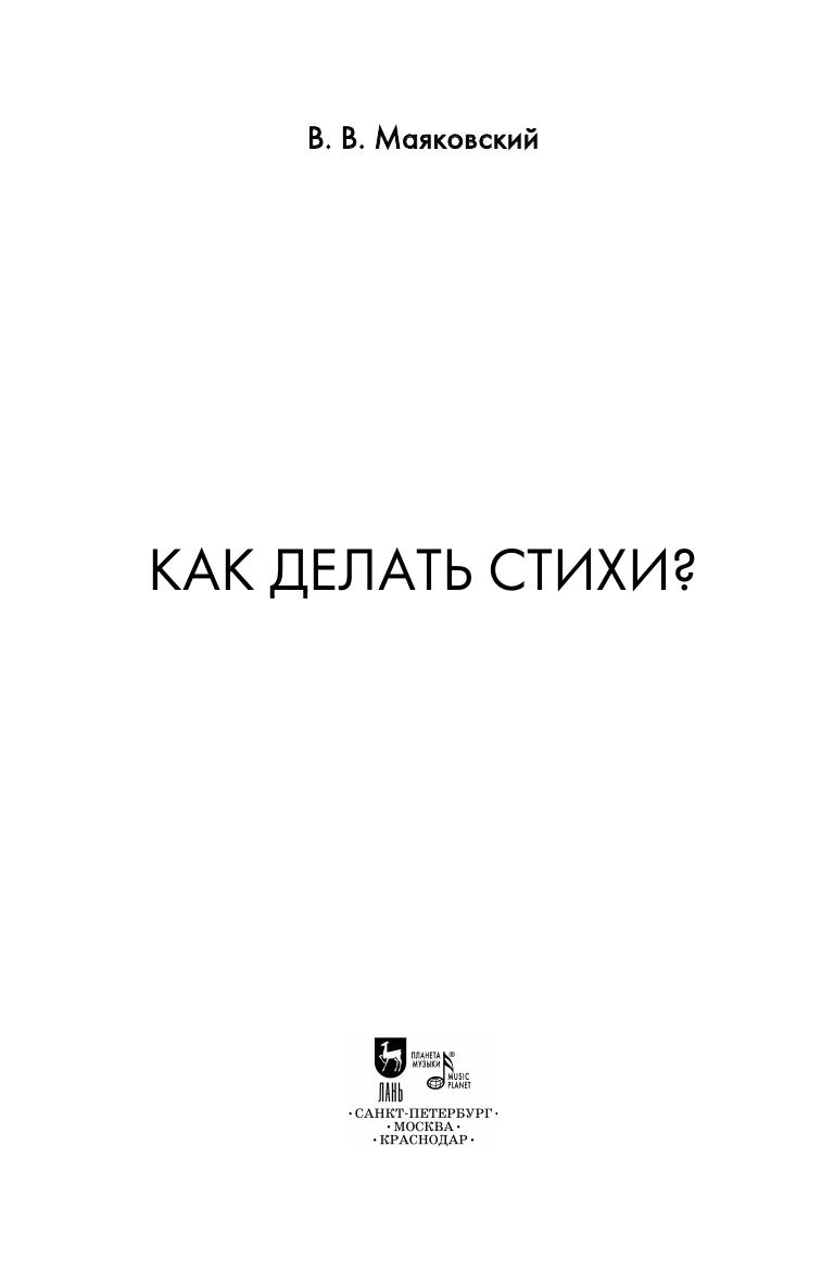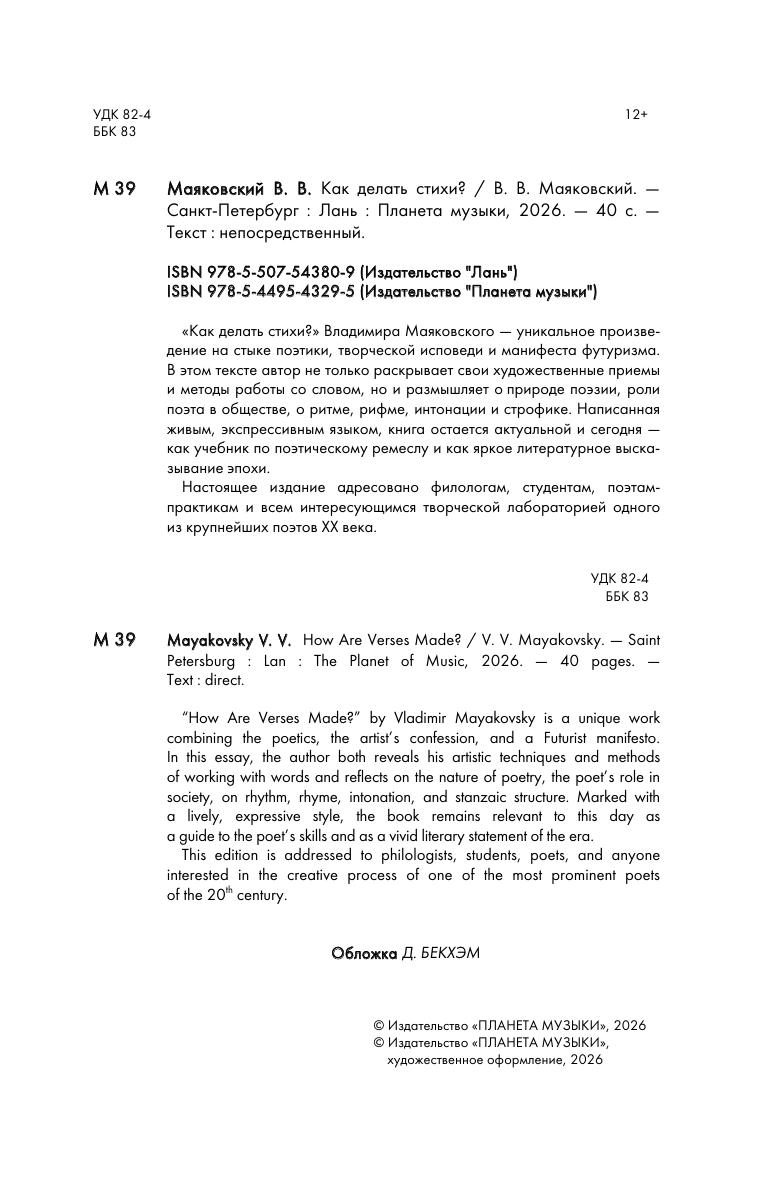 «Как делать стихи?» Владимира Маяковского — уникальное произведение на стыке поэтики, творческой исповеди и манифеста футуризма. В этом тексте автор не только раскрывает свои художественные приёмы и методы работы со словом, но и размышляет о природе поэзии, роли поэта в обществе, о ритме, рифме, интонации и строфике. Написанная живым, экспрессивным языком, книга остаётся актуальной и сегодня — как учебник по поэтическому ремеслу и как яркое литературное высказывание эпохи. Настоящее издание адресовано филологам, студентам, поэтам-практикам и всем интересующимся творческой лабораторией одного из крупнейших поэтов XX века. “How Are Verses Made?” by Vladimir Mayakovsky is a unique work combining the poetics, the artist’s confession, and a Futurist manifesto. In this essay, the author both reveals his artistic techniques and methods of working with words and reflects on the nature of poetry, the poet’s role in society, on rhythm, rhyme, intonation, and stanzaic structure. Marked with a lively, expressive style, the book remains relevant to this day as a guide to the poet’s skills and as a vivid literary statement of the era. This edition is addressed to philologists, students, poets, and anyone interested in the creative process of one of the most prominent poets of the 20th century.