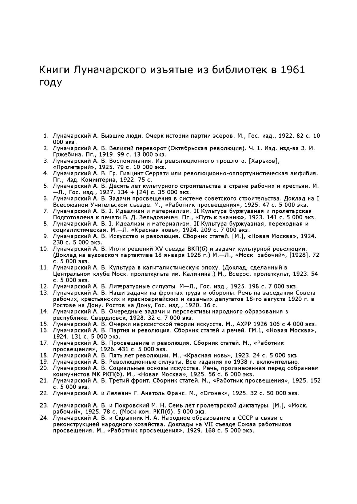 Книги Луначарского, изъятые из библиотек в 1961 году