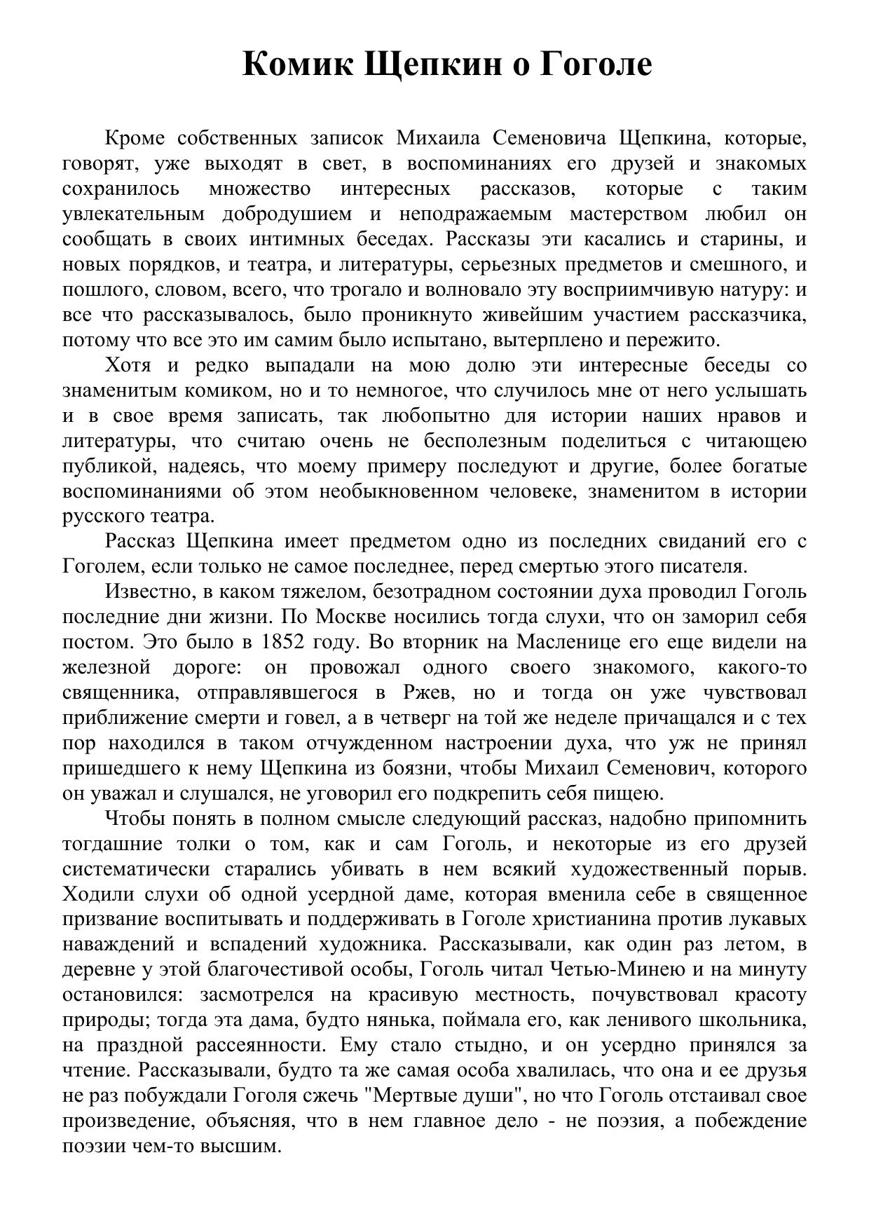 Комик Щепкин о Гоголе