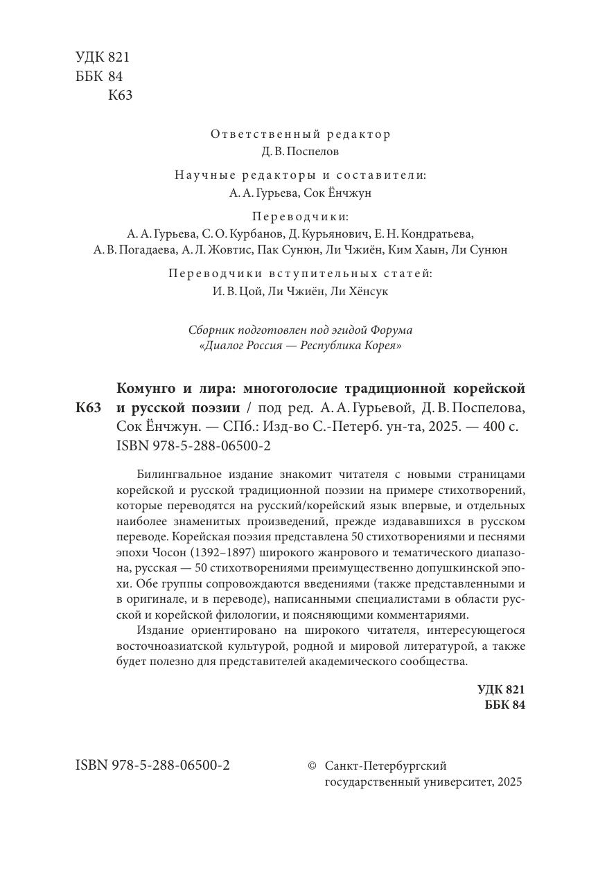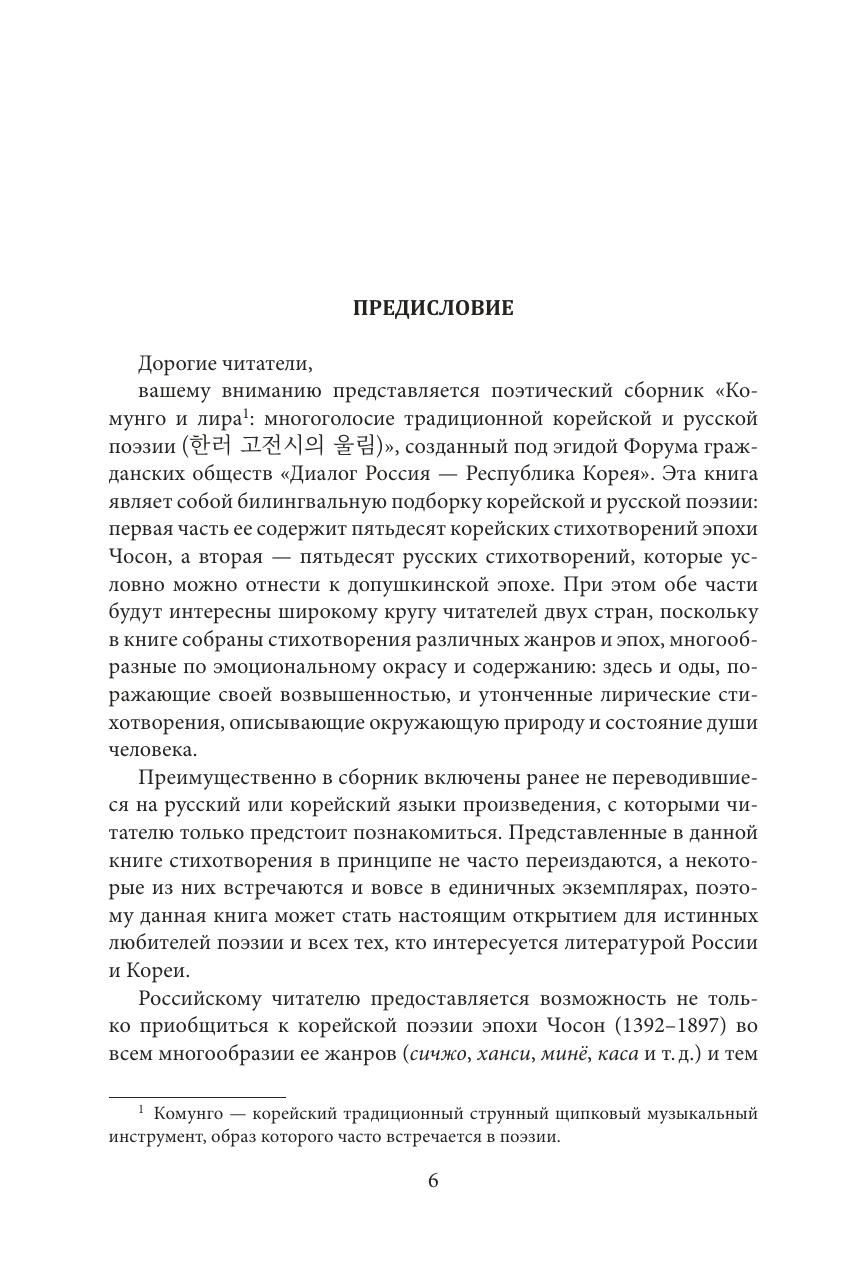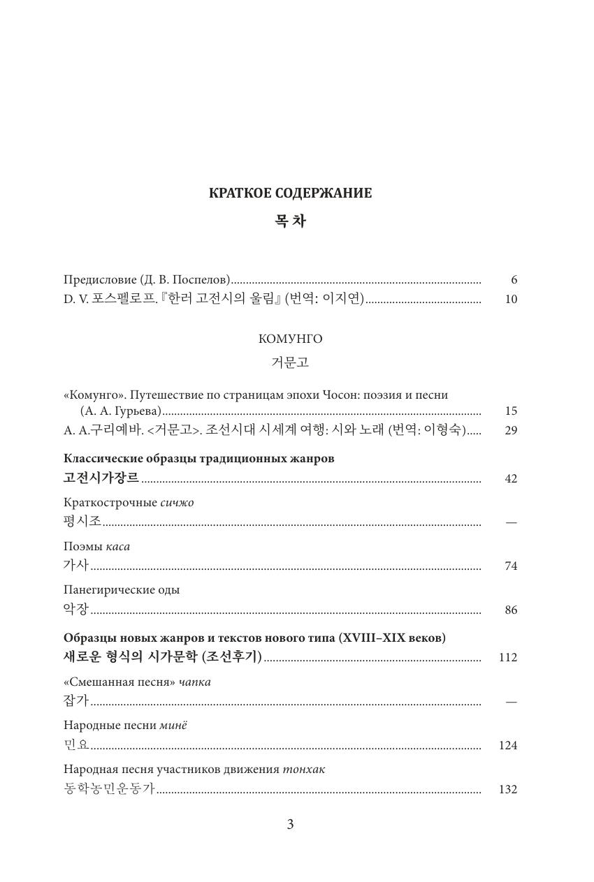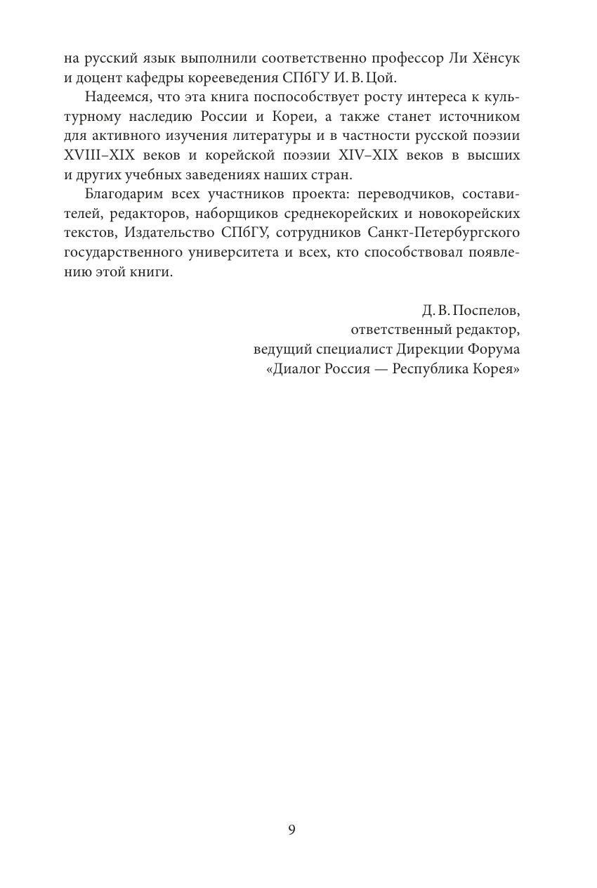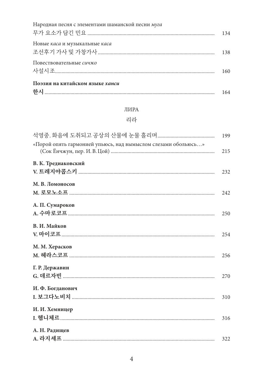 Билингвальное издание знакомит читателя с новыми страницами корейской и русской традиционной поэзии на примере стихотворений, которые переводятся на русский/корейский язык впервые, и отдельных наиболее знаменитых произведений, прежде издававшихся в русском переводе. Корейская поэзия представлена 50 стихотворениями и песнями эпохи Чосон (1392–1897) широкого жанрового и тематического диапазона, русская — 50 стихотворениями преимущественно допушкинской эпохи. Обе группы сопровождаются введениями (также представленными и в оригинале, и в переводе), написанными специалистами в области русской и корейской филологии, и поясняющими комментариями. Издание ориентировано на широкого читателя, интересующегося восточноазиатской культурой, родной и мировой литературой, а также будет полезно для представителей академического сообщества.