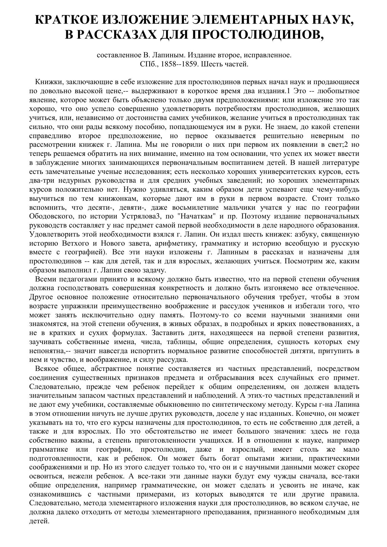 Краткое изложение элементарных наук, в рассказах для простолюдинов, составленное В. Лапиным