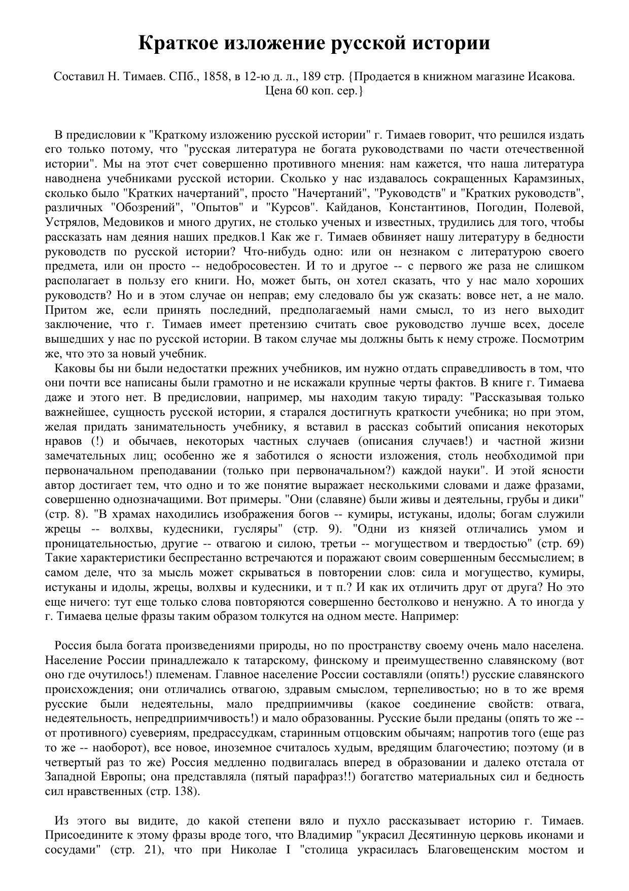 Краткое изложение русской истории. Составил Н. Тимаев