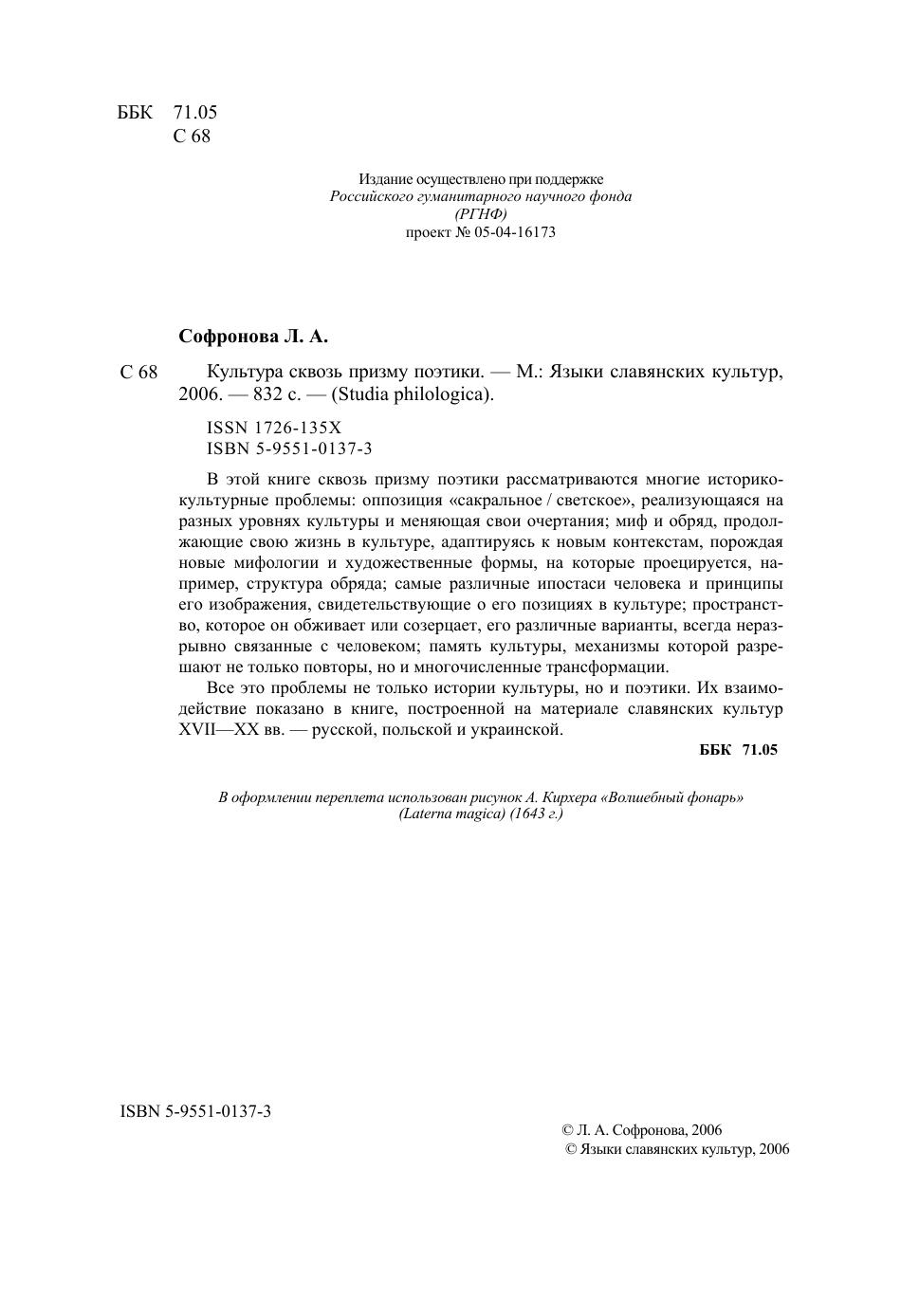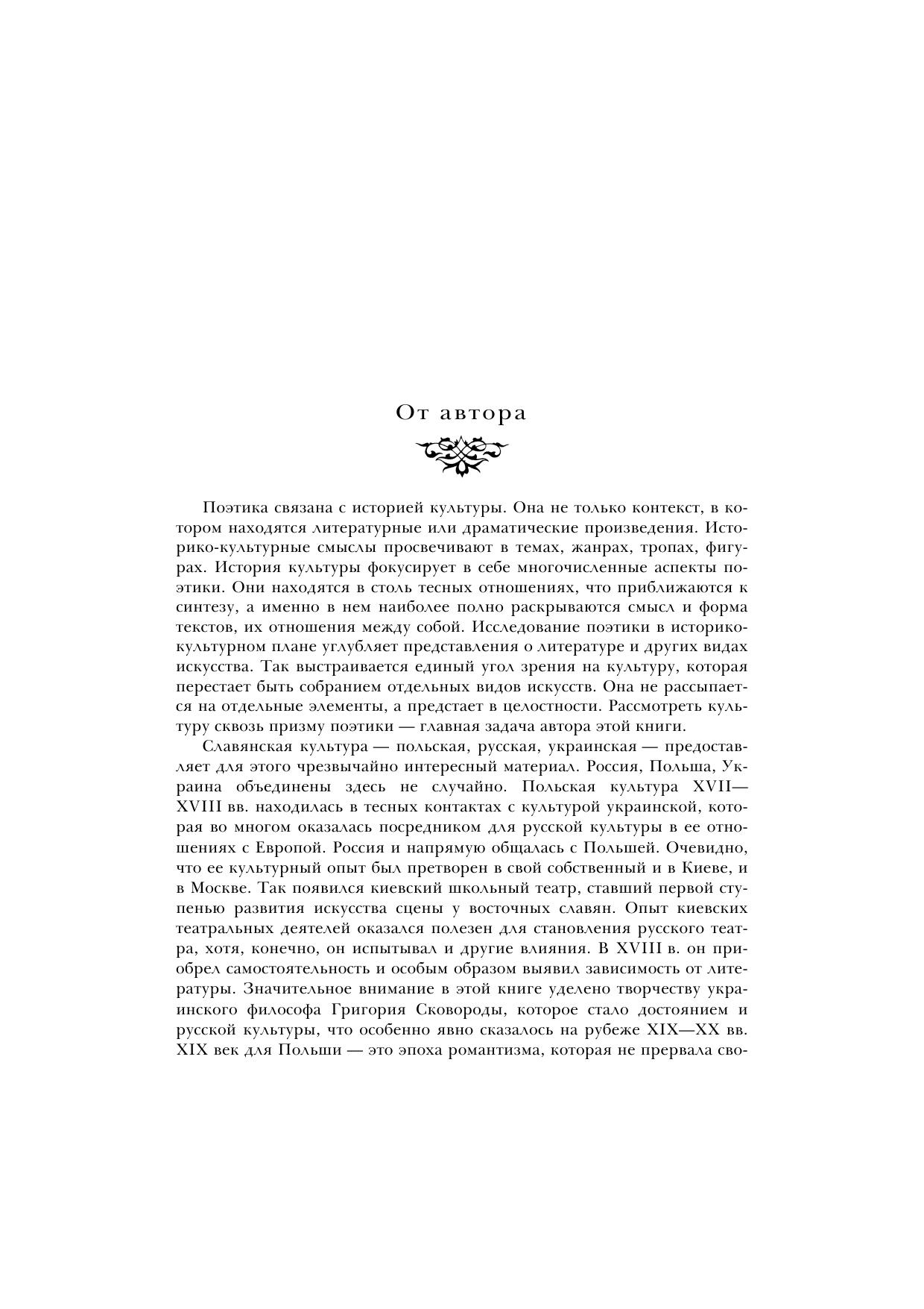 В этой книге сквозь призму поэтики рассматриваются многие историко-культурные проблемы: оппозиция «сакральное / светское», реализующаяся на разных уровнях культуры и меняющая свои очертания, миф и обряд, продолжающие свою жизнь в культуре, адаптируясь к новым контекстам, порождая новые мифологии и художественные формы, на которые проецируется, например, структура обряда, самые различные ипостаси человека и принципы его изображения, свидетельствующие о его позициях в культуре, пространство, которое он обживает или созерцает, его различные варианты, всегда неразрывно связанные с человеком, память культуры, механизмы которой разрешают не только повторы, но и многочисленные трансформации. Все это проблемы не только истории культуры, но и поэтики. Их взаимодействие показано в книге, построенной на материале славянских культур XVII–XX вв. – русской, польской и украинской.