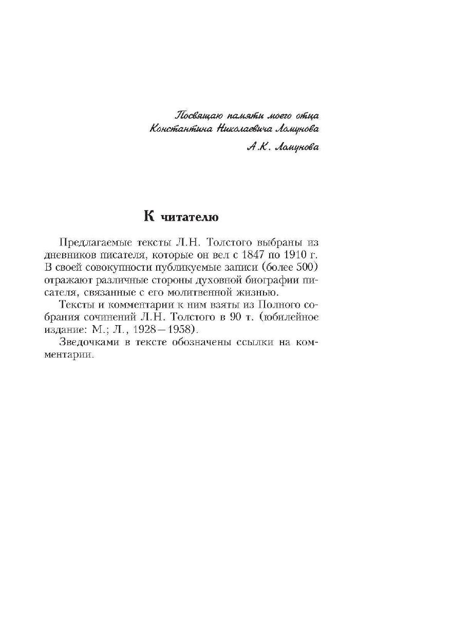 Предлагаемые тексты Л.Н. Толстого выбраны из дневников писателя, которые он вел с перерывами с 1847 по 1910 г. Они собраны по признаку присутствия в них ключевого понятия «молитва». В сборнике представлено более 500 записей.