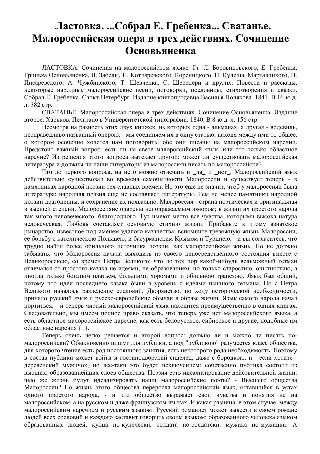 Ластовка. ...Собрал Е. Гребенка... Сватанье. Малороссийская опера в трех действиях. Сочинение Основьяненка