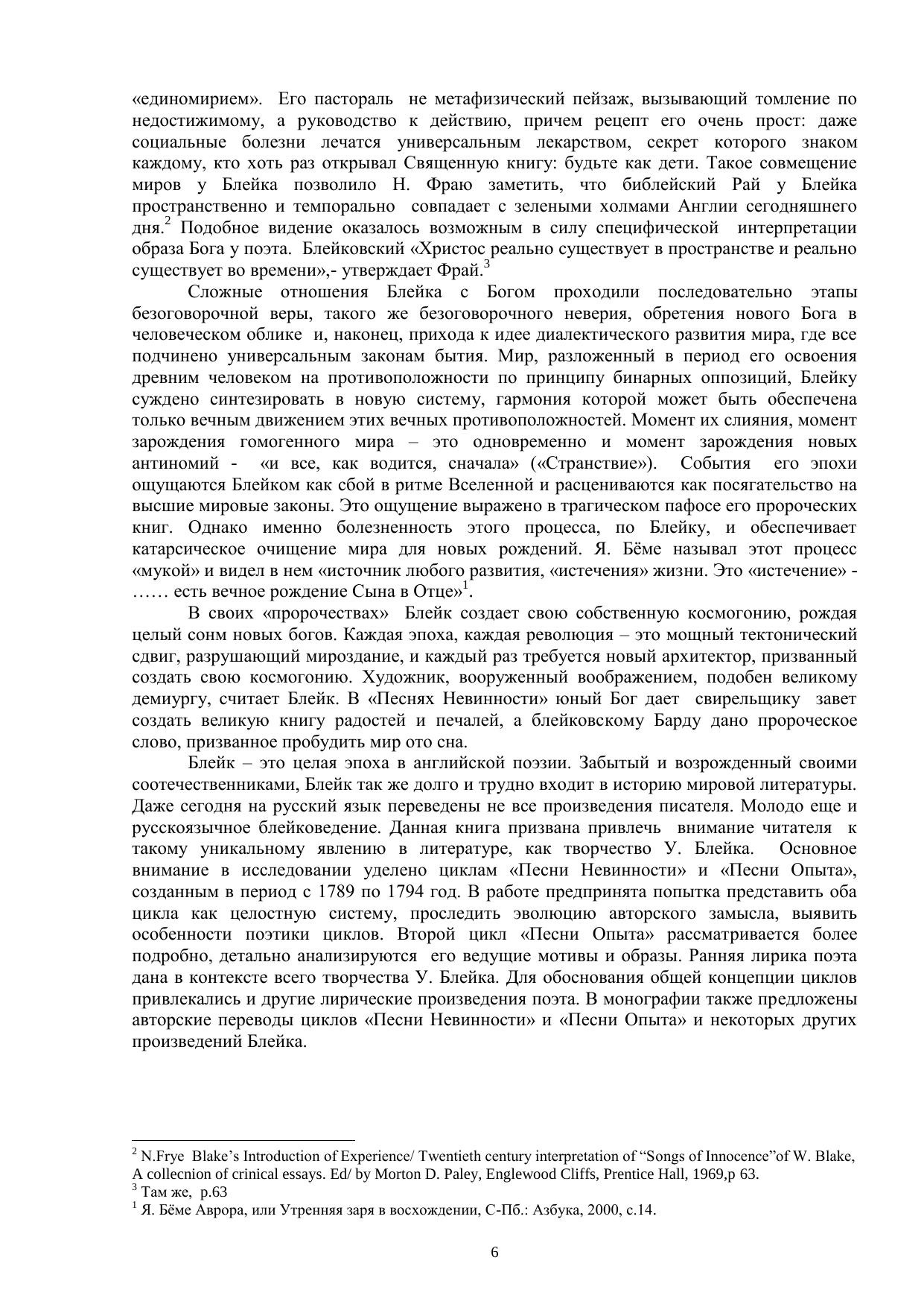 В работе предпринята попытка представить оба цикла как целостную систему, проследить эволюцию авторского замысла, выявить особенности поэтики циклов. Второй цикл «Песни Опыта» рассматривается более подробно, детально анализируются его ведущие мотивы и образы. Ранняя лирика поэта дана в контексте всего творчества У. Блейка. Для обоснования общей концепции циклов привлекались и другие лирические произведения поэта. В монографии также предложены авторские переводы циклов «Песни Невинности» и «Песни Опыта» и некоторых других произведений Блейка.